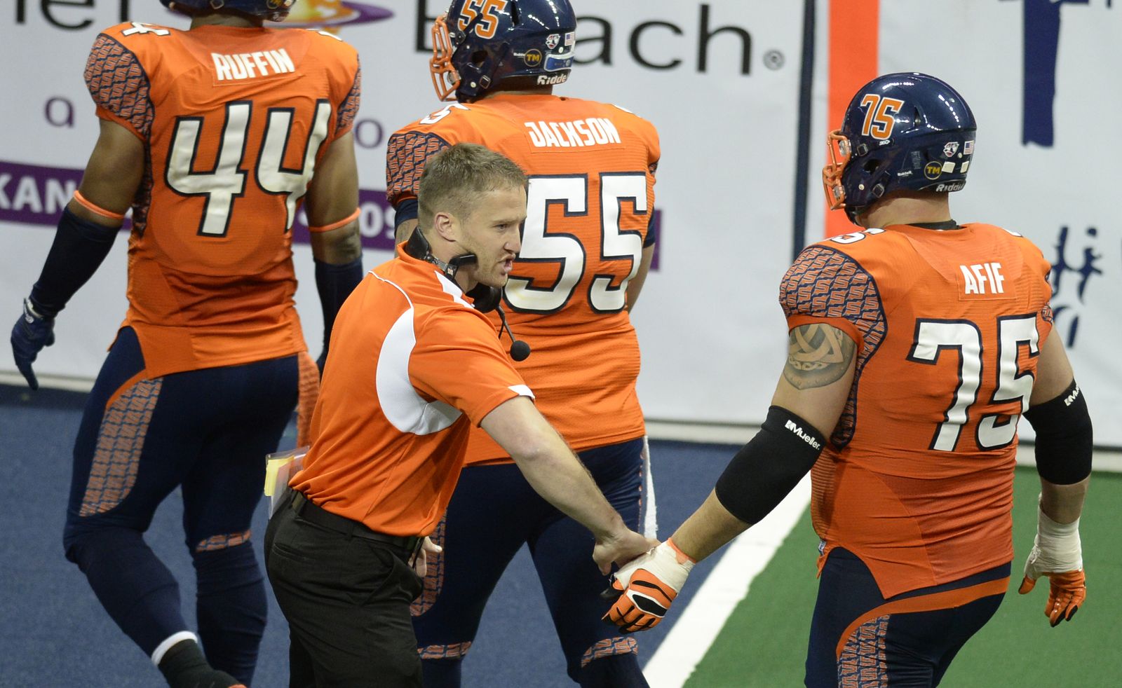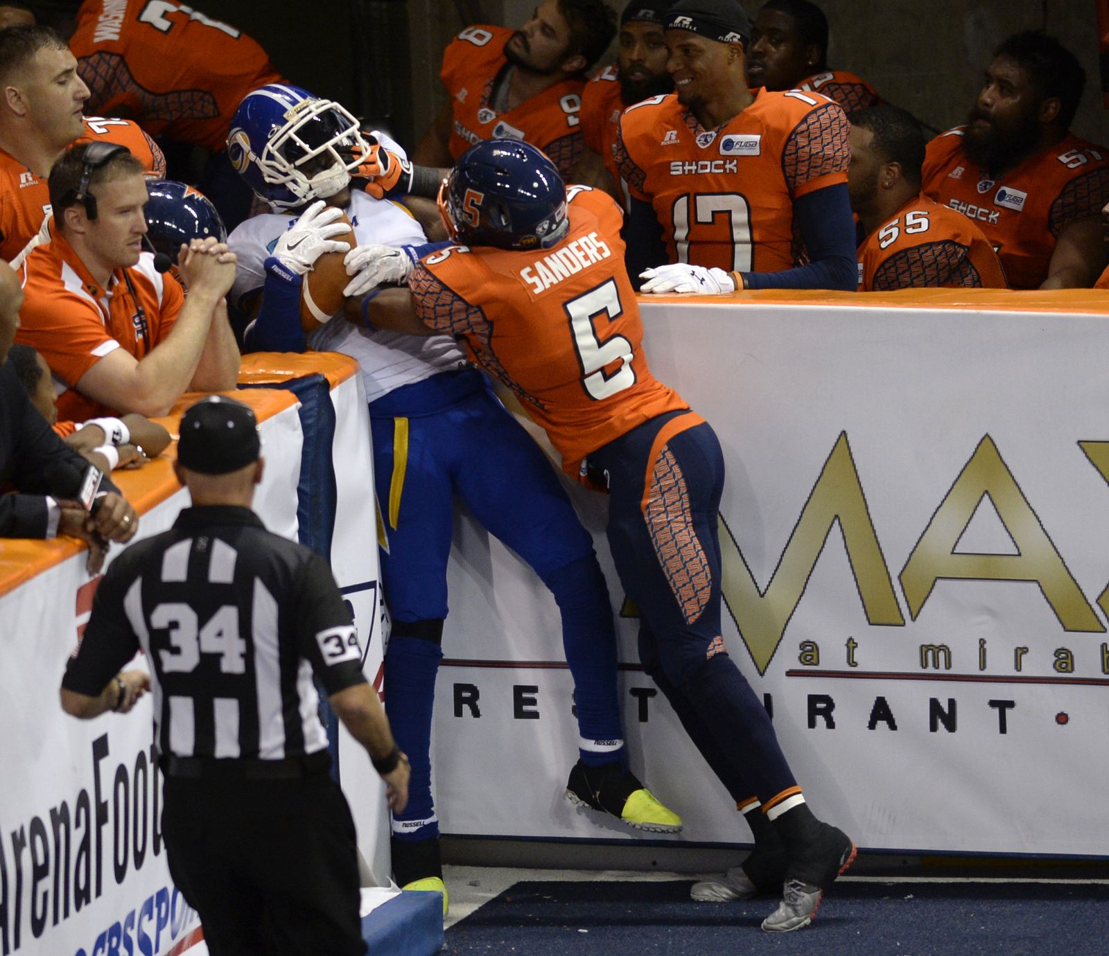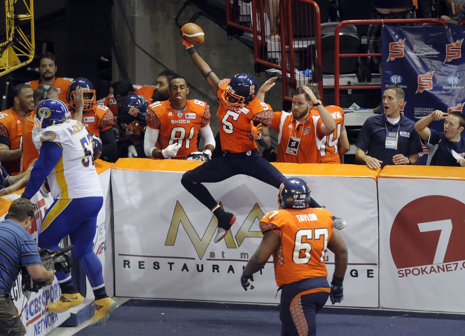 Mike Washington of the Spokane Shock makes a diving reception on top of the wall against Tampa Bay Monday, July 21, 2014 at the Spokane Arena. The call was challenged on the believe that a fan touched the ball, but it was confirmed. The Shock beat the Tampa Bay Thunder 55-52.