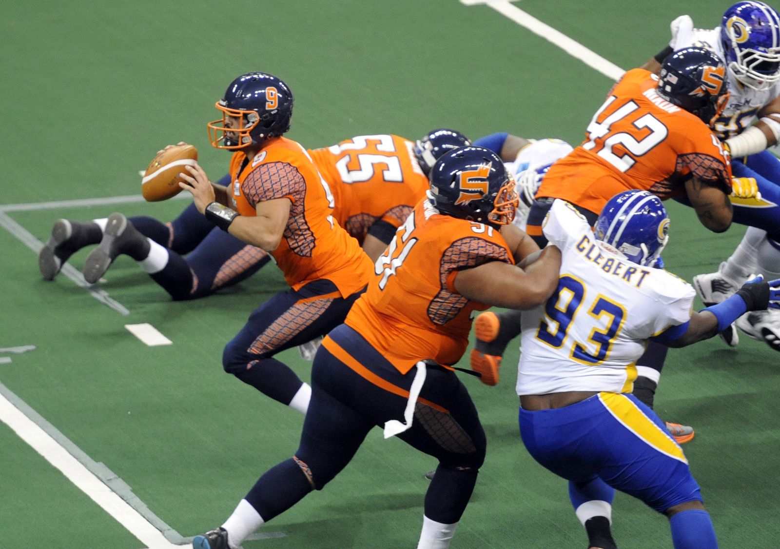 Tampa Bay quarterback Randy Hippeard feels the pressure from the shock defense as he moves out of the pocket Monday, July 21, 2014 at the Spokane Arena. The Shock beat the Tampa Bay Thunder 55-52.