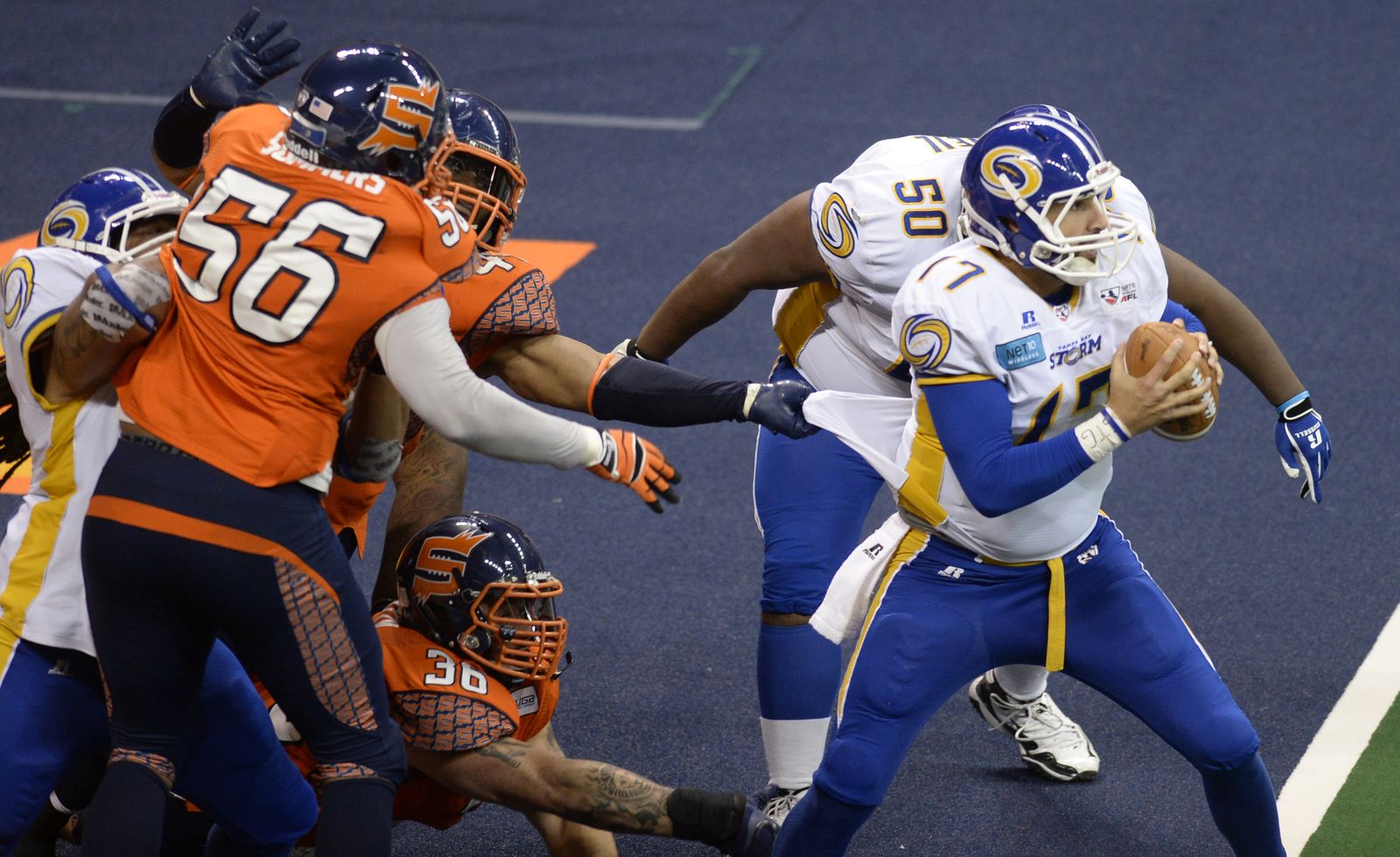 Paul Stephens of the Spokane Shock brings down Tampa Bay receiver Amarri Jackson at midfield Monday, July 21, 2014 at the Spokane Arena. The Shock beat the Tampa Bay Thunder 55-52.
