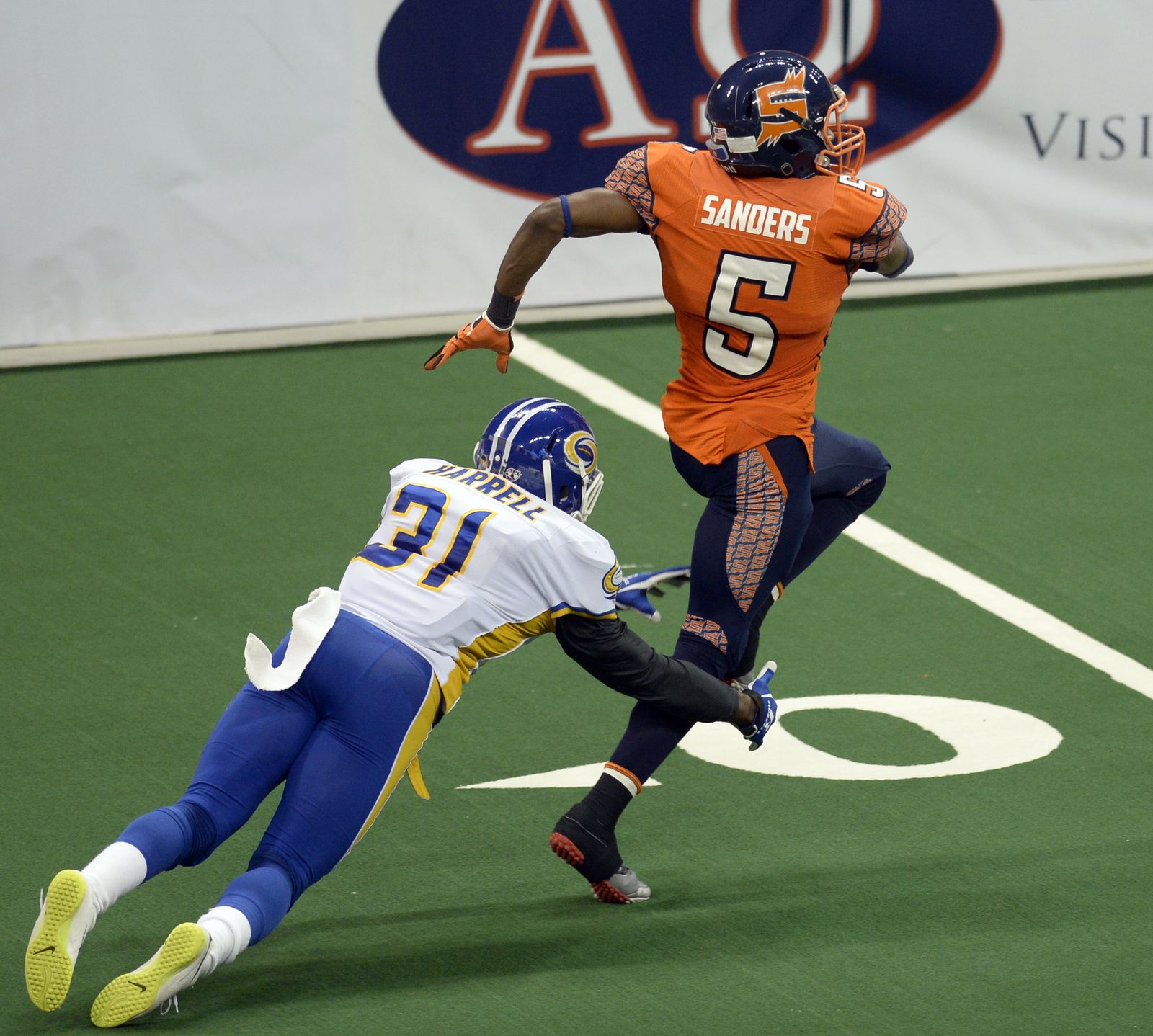 Terrance Sanders of the Spokane Shock takes a kickoff and scampers out of the grasp of Tampa Bay’s James Harrell for a touchdown Monday, July 21, 2014 at the Spokane Arena. The Shock beat the Tampa Bay Thunder 55-52.