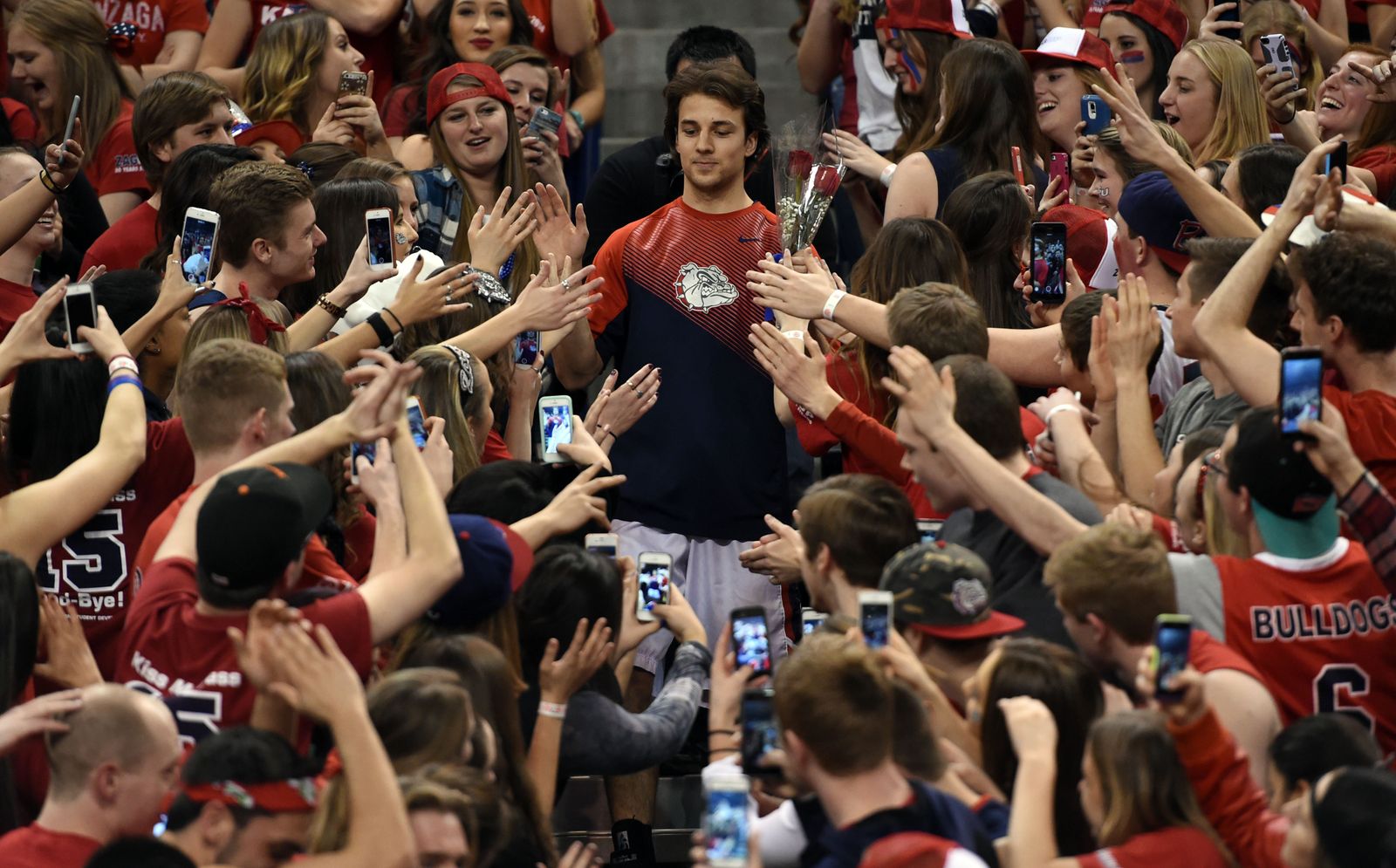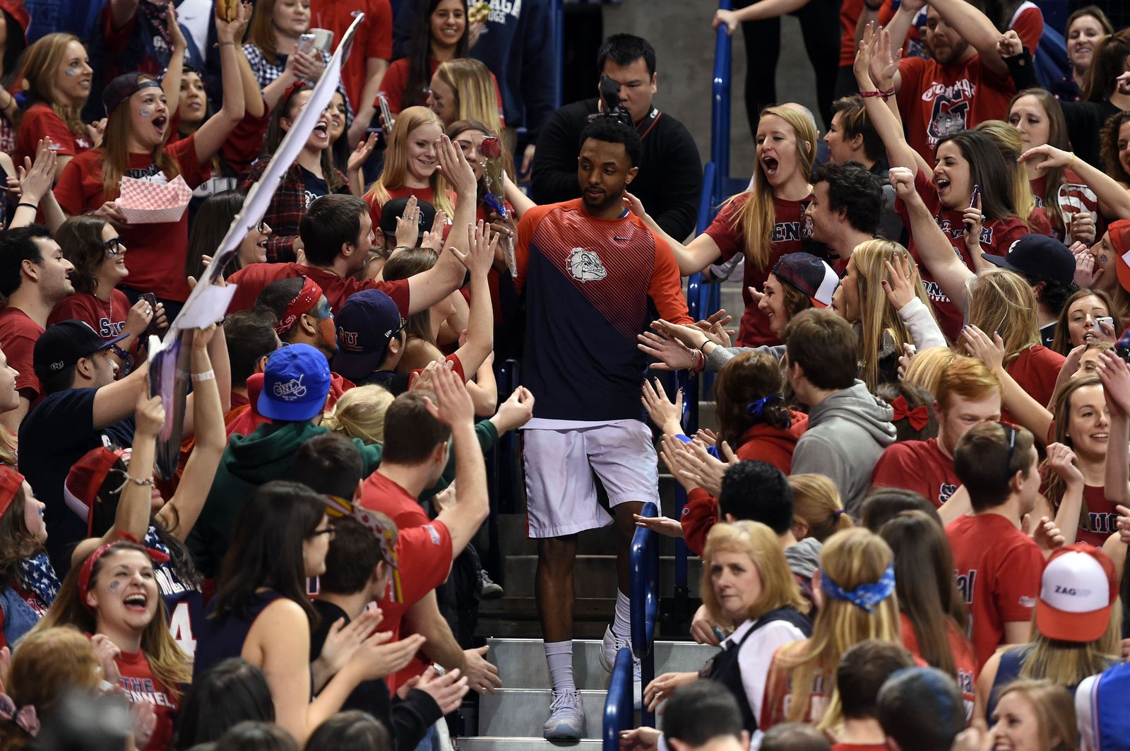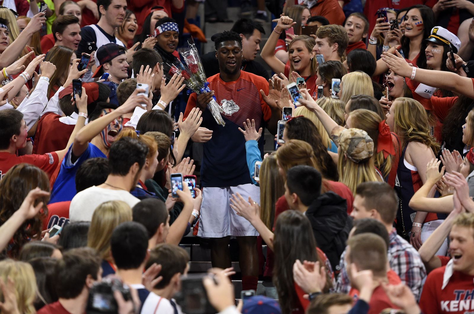 On Senior Night, Gonzaga guard Gary Bell Jr. (5) makes his way through the student section before the game with BYU, Sat., Feb. 28, 2015, in the McCarthey Athletic Center.