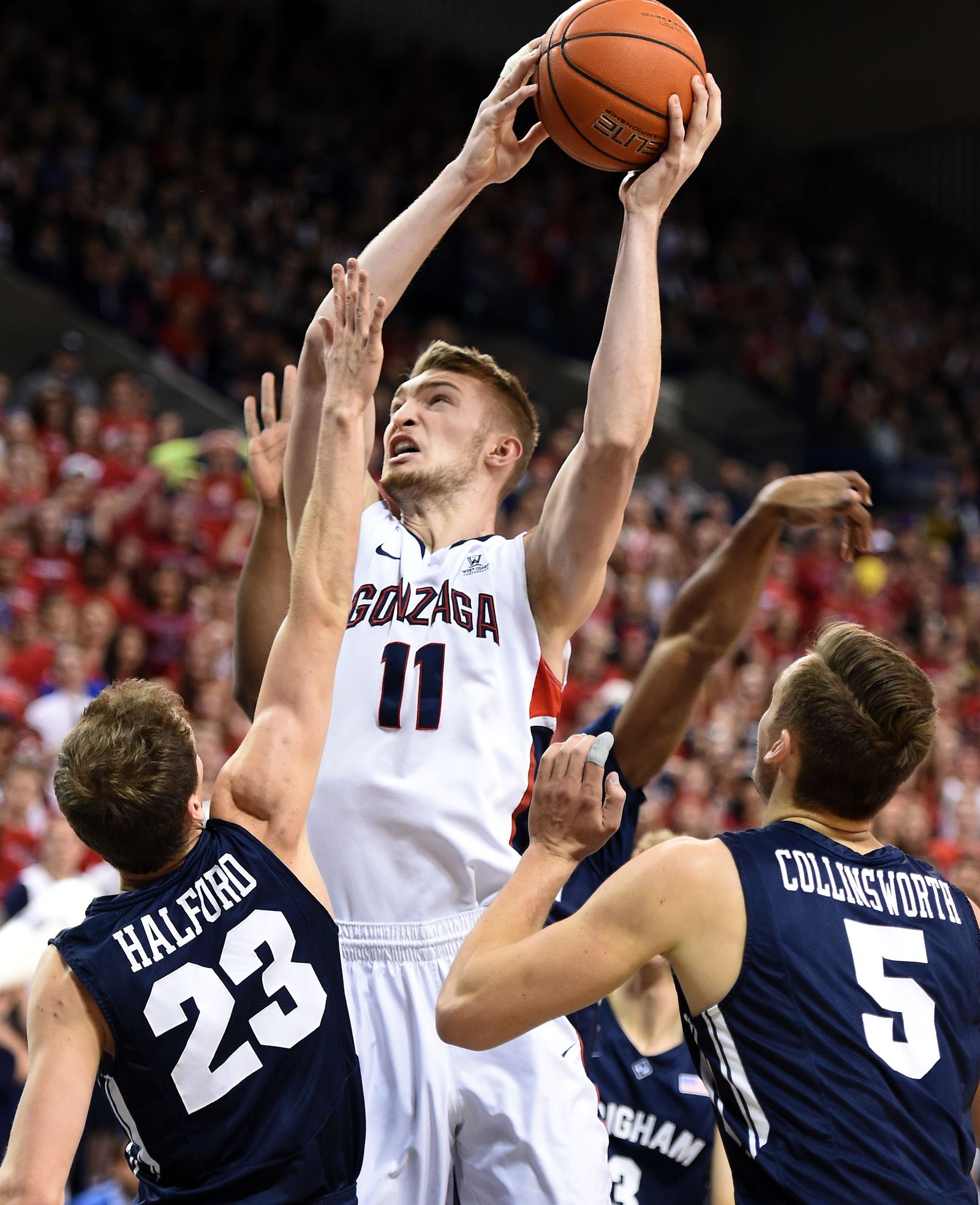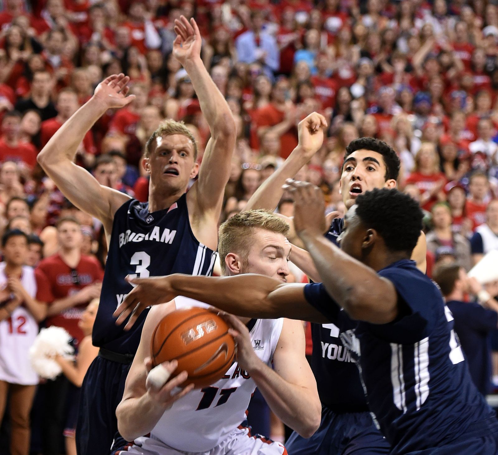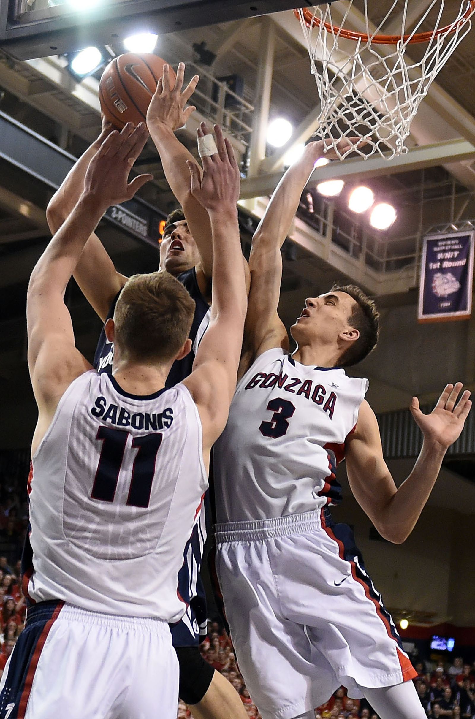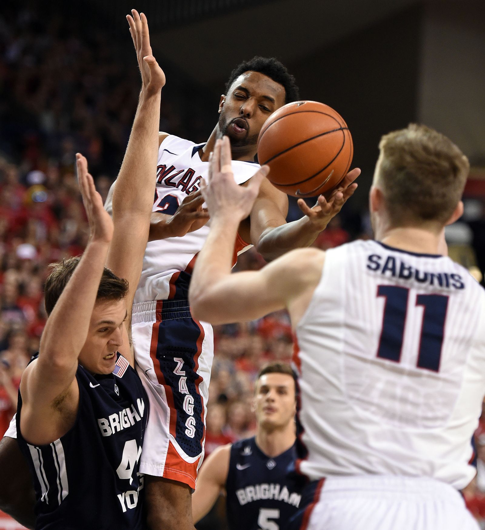 Gonzaga forward Domantas Sabonis (11) is triple-teamed under the basket by Brigham Young guard Tyler Haws (3), Brigham Young center Corbin Kaufusi (in back) and Brigham Young guard Frank Bartley IV (24) in the first half of an NCAA men’s college basketball game, Sat., Feb. 28, 2015, in the McCarthey Athletic Center.