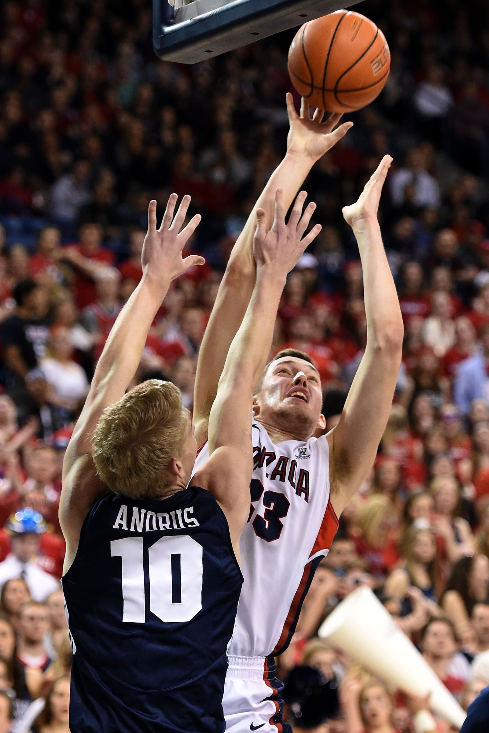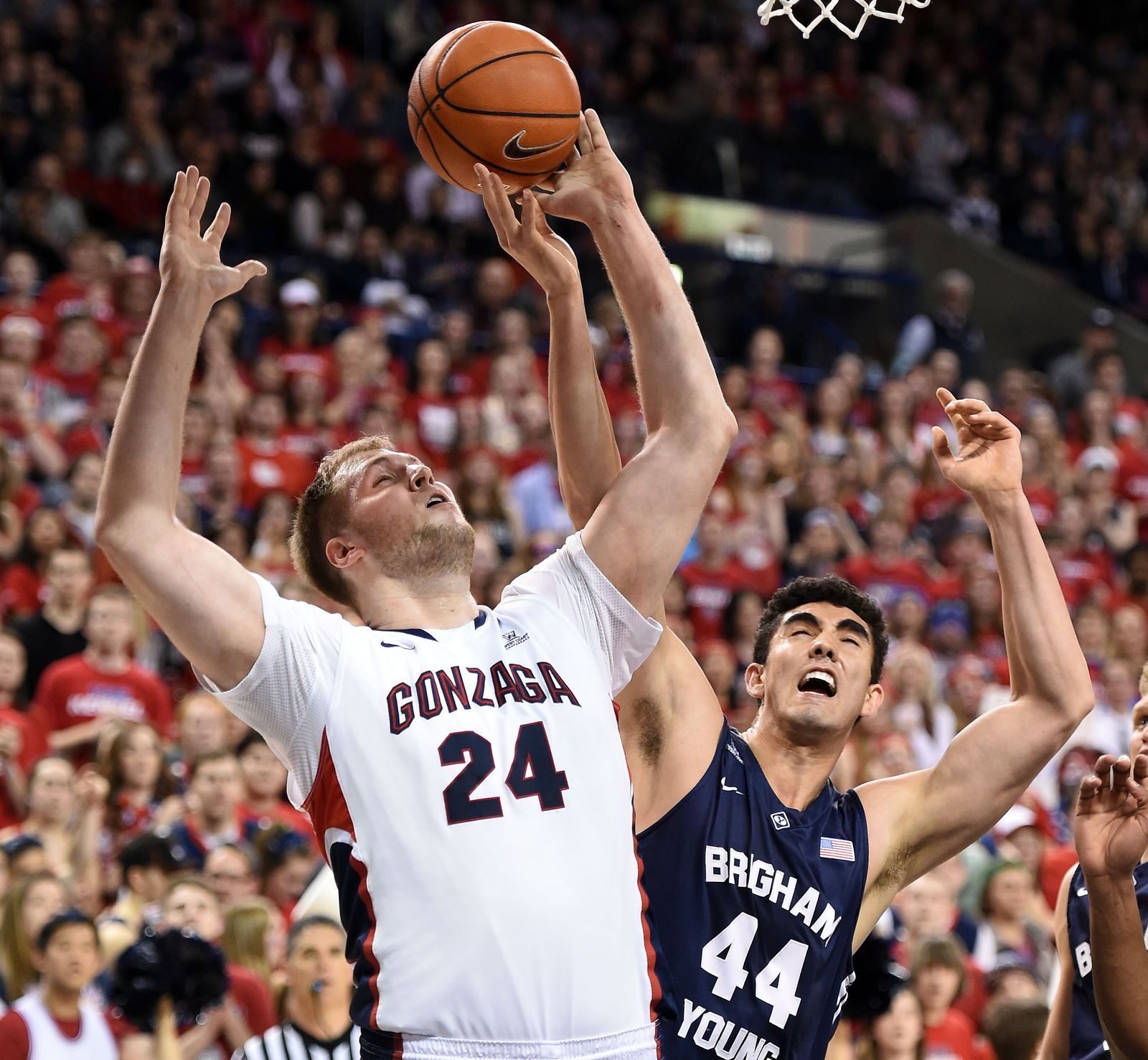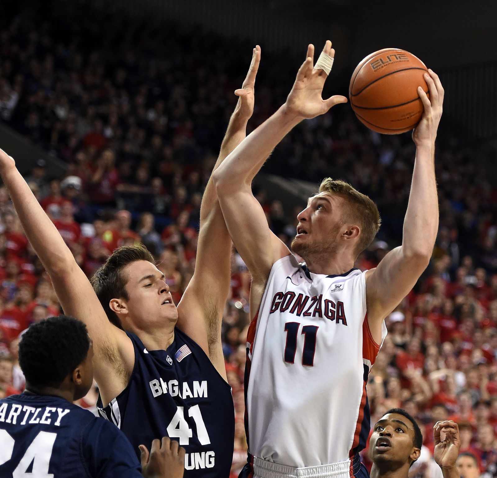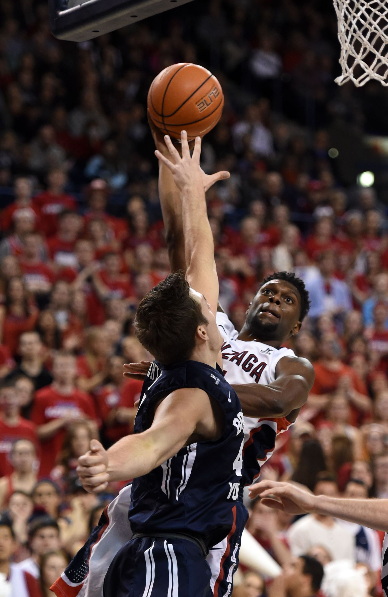 Brigham Young center Corbin Kaufusi (44) gets a hand on the ball as Gonzaga center Przemek Karnowski (24) shoots the ball in the first half of an NCAA men’s college basketball game, Sat., Feb. 28, 2015, in the McCarthey Athletic Center.