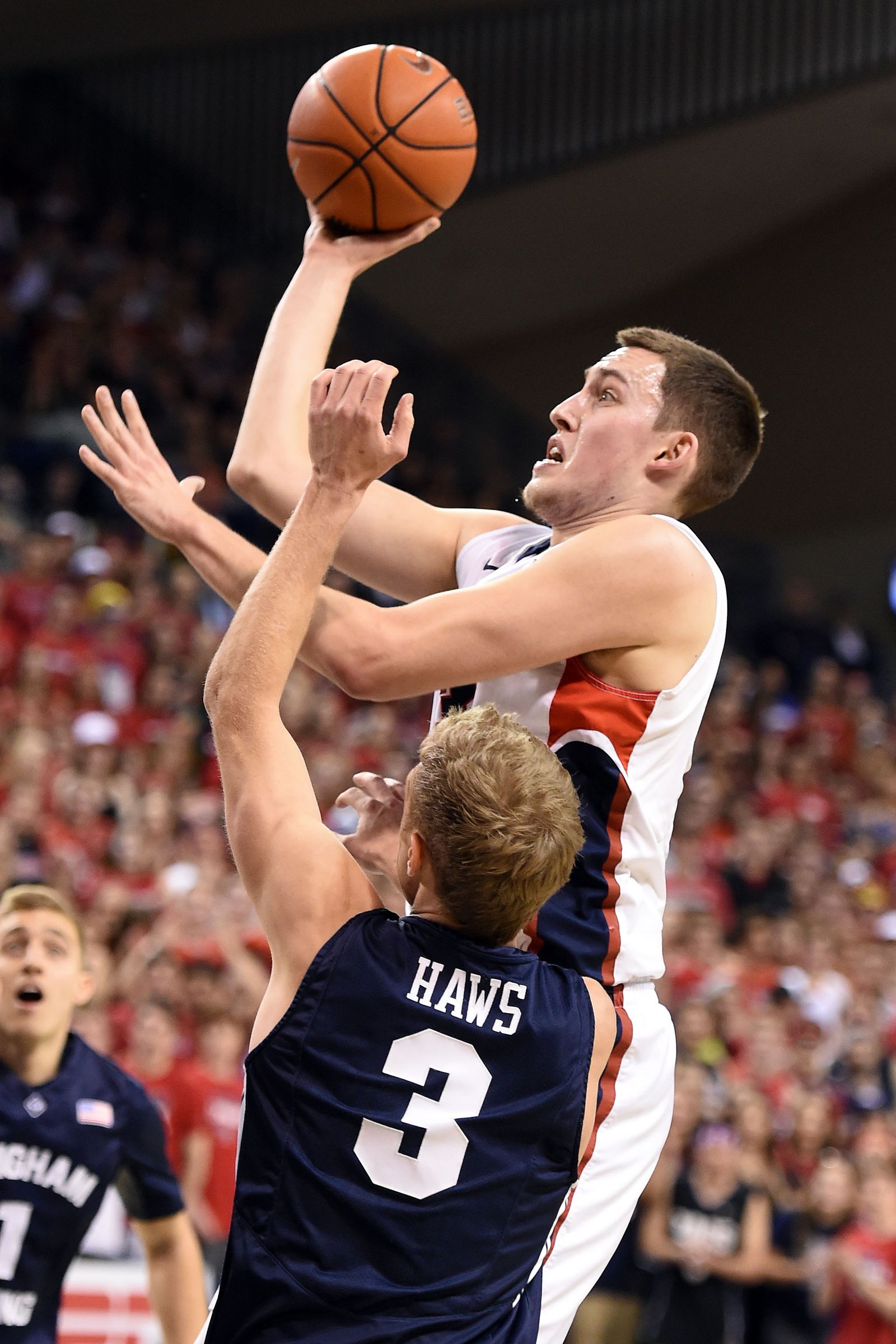 Gonzaga forward Kyle Wiltjer (33) lines up a shot as Brigham Young guard Tyler Haws (3) defends in the first half of an NCAA men’s college basketball game, Sat., Feb. 28, 2015, in the McCarthey Athletic Center.