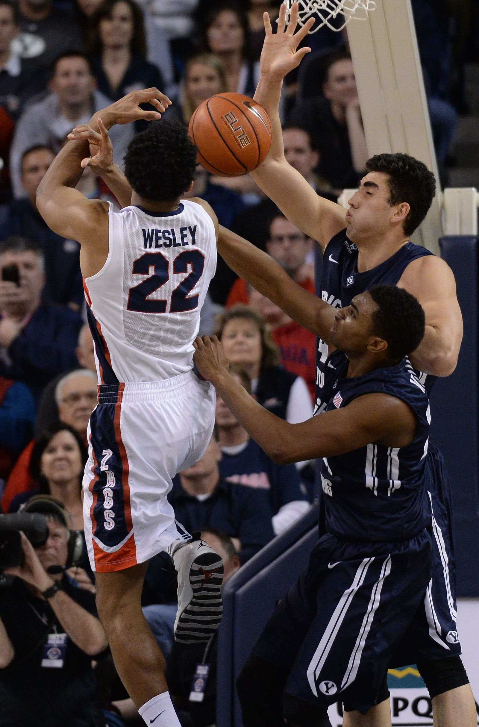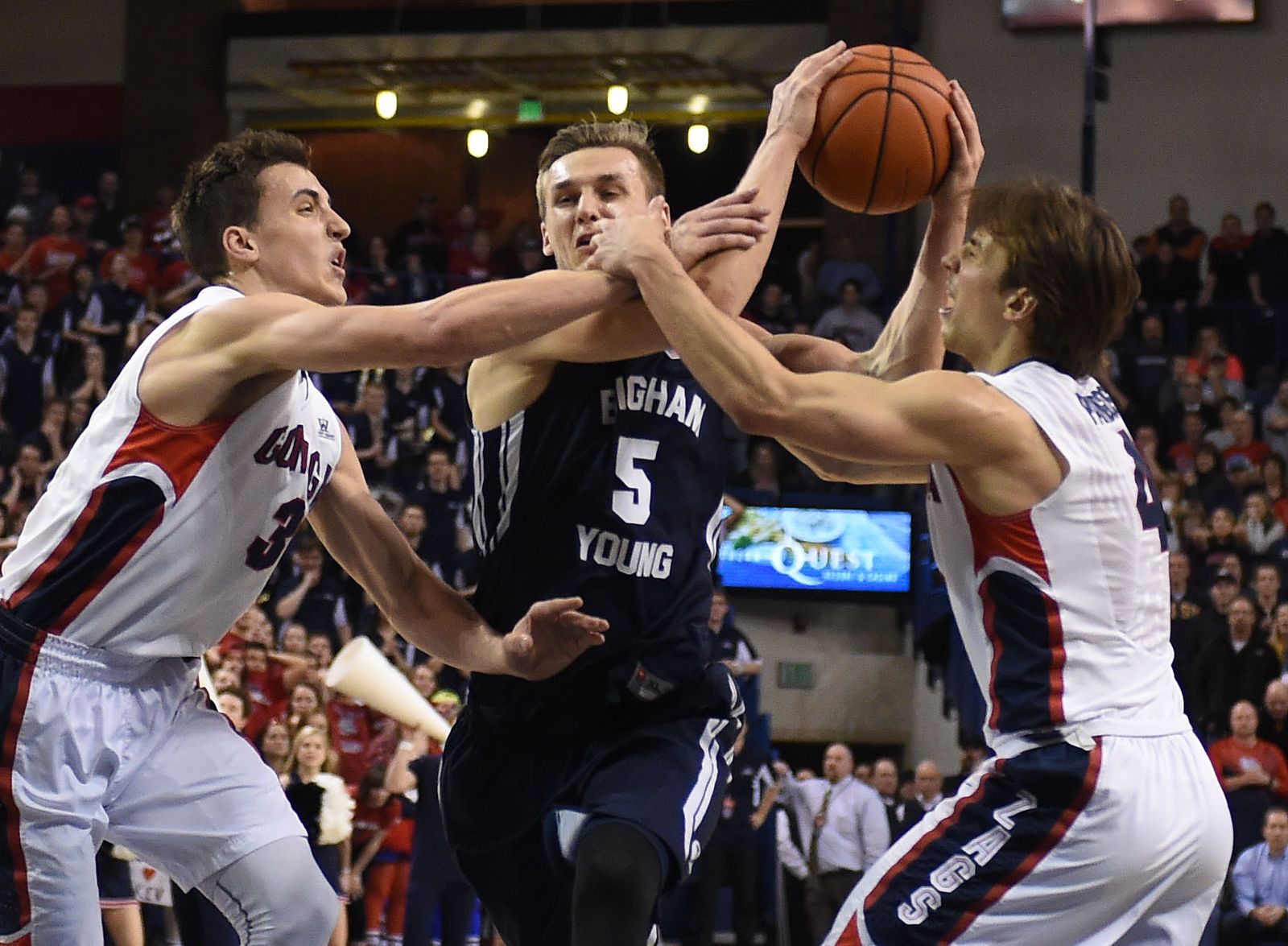 As Brigham Young guard Kyle Collinsworth (5) enters the key, Gonzaga guard Kyle Dranginis (3) and Gonzaga guard Kevin Pangos (4) defend in the second half of an NCAA men’s college basketball game, Sat., Feb. 28, 2015, in the McCarthey Athletic Center.