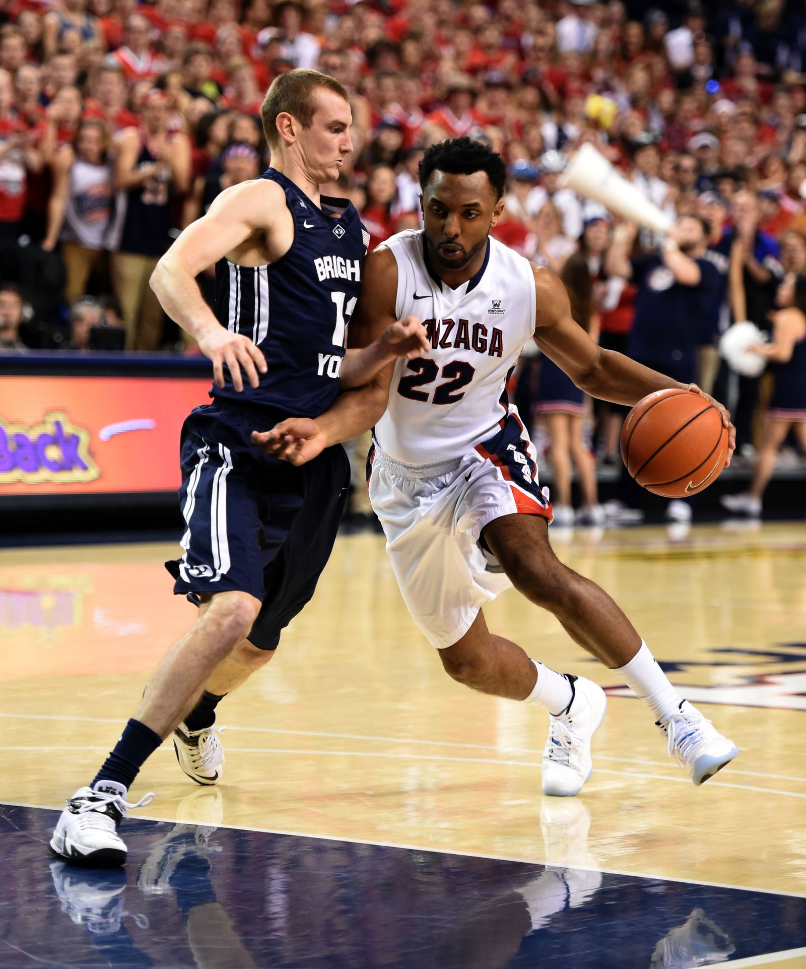 Gonzaga guard Byron Wesley (22) makes his way into the key as Brigham Young forward Josh Sharp (12) defends in the first half of an NCAA men’s college basketball game, Sat., Feb. 28, 2015, in the McCarthey Athletic Center.