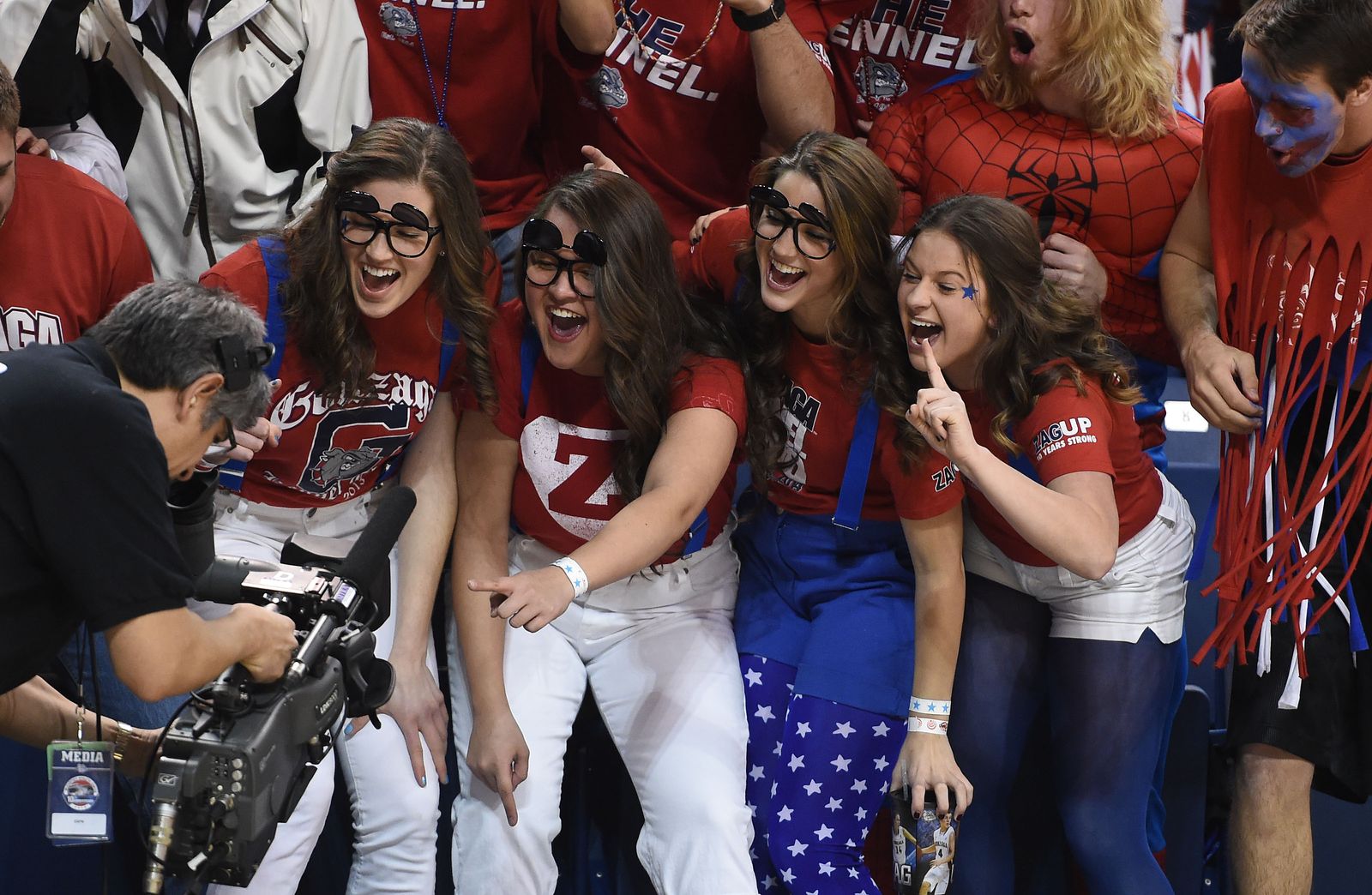 Students mug for the camera in the first half of an NCAA men’s college basketball game, Sat., Feb. 28, 2015, in the McCarthey Athletic Center.