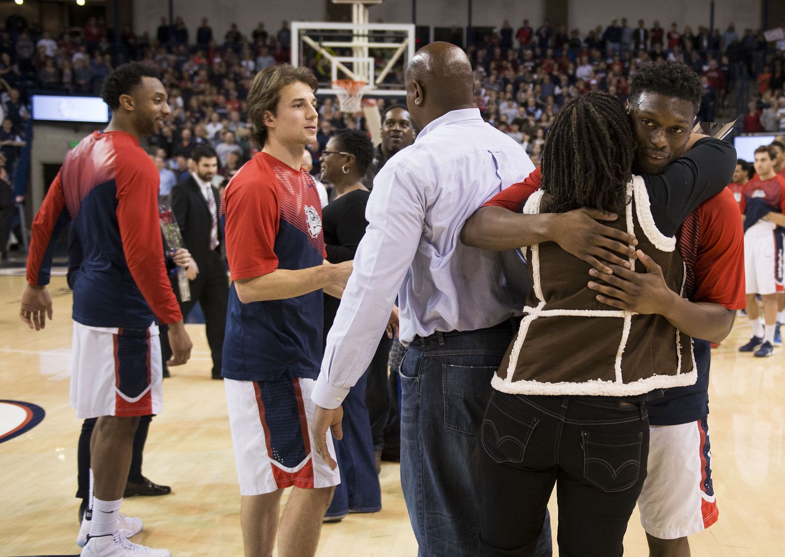 On Senior night, left to right, Gonzaga guard Byron Wesley, Kevin Pangos and Gary Bell Jr. greet each other’s families, Sat., Feb. 28, 2015, in the McCarthey Athletic Center.
