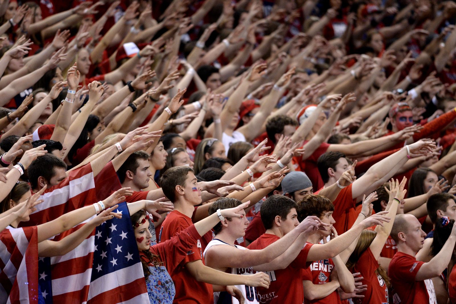 The Gonzaga student section wiggles their fingers during a Bulldog free throw in the second half of an NCAA men’s college basketball game, Sat., Feb. 28, 2015, in the McCarthey Athletic Center.