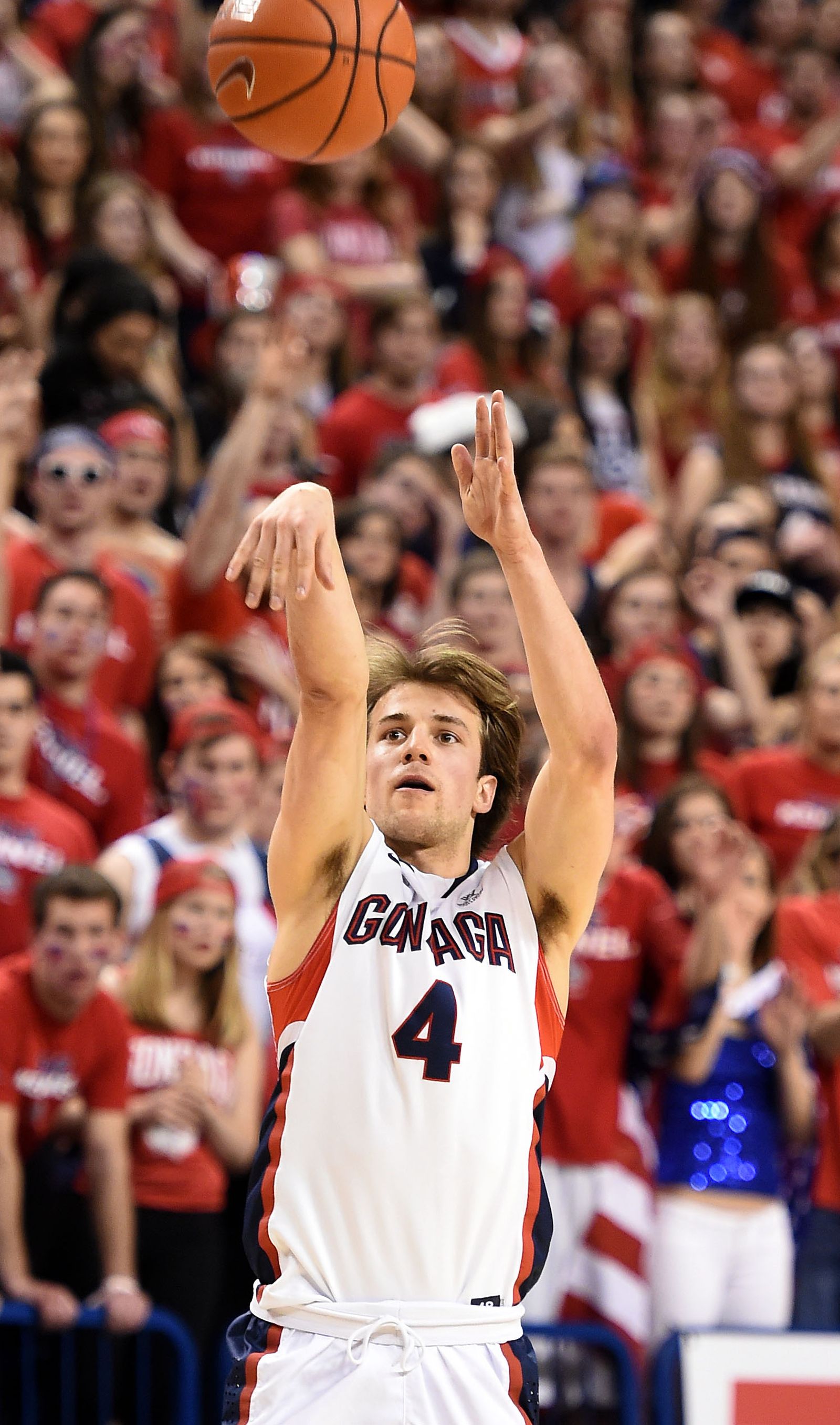 Gonzaga guard Kevin Pangos (4) shoots a three-pointer in the first half of an NCAA men’s college basketball game, Sat., Feb. 28, 2015, in the McCarthey Athletic Center.