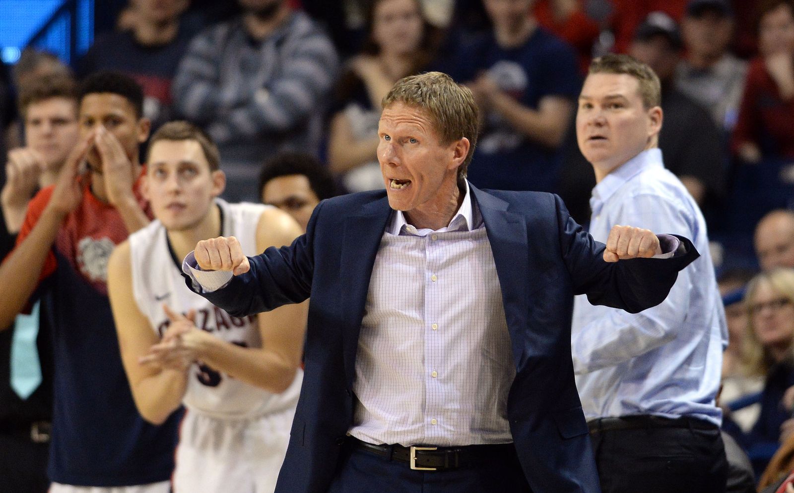 Gonzaga head coach Mark Few gives players on the court directions in the second half of an NCAA men’s college basketball game, Sat., Feb. 28, 2015, in the McCarthey Athletic Center.