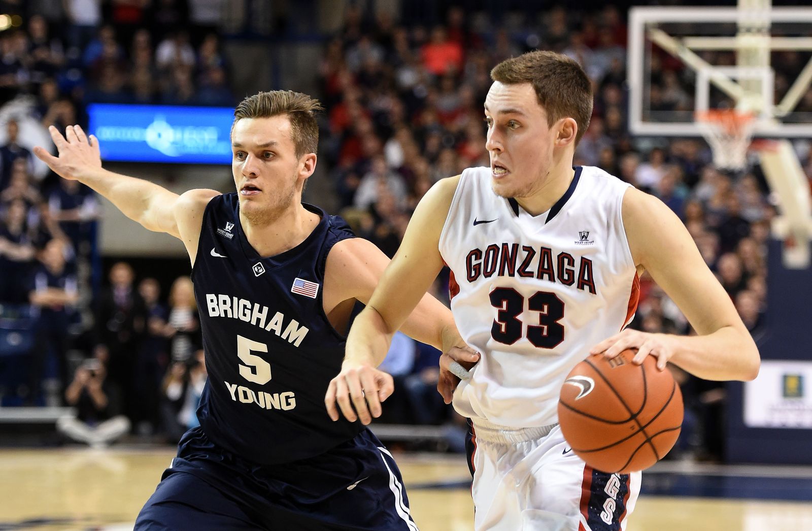 Gonzaga forward Kyle Wiltjer (33) heads downcourt as Brigham Young guard Kyle Collinsworth (5) defends in the first half of an NCAA men’s college basketball game, Sat., Feb. 28, 2015, in the McCarthey Athletic Center.