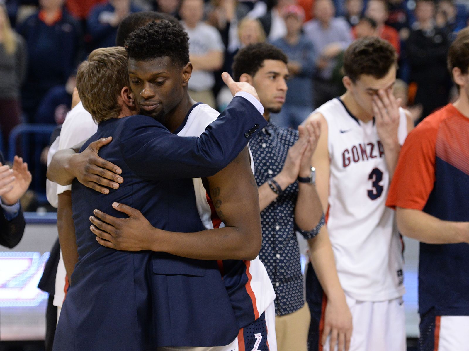 Gonzaga head coach Mark Few hugs Gonzaga guard Gary Bell Jr. (5) after the Bulldogs lost to BYU 73-70, Sat., Feb. 28, 2015, in the McCarthey Athletic Center.