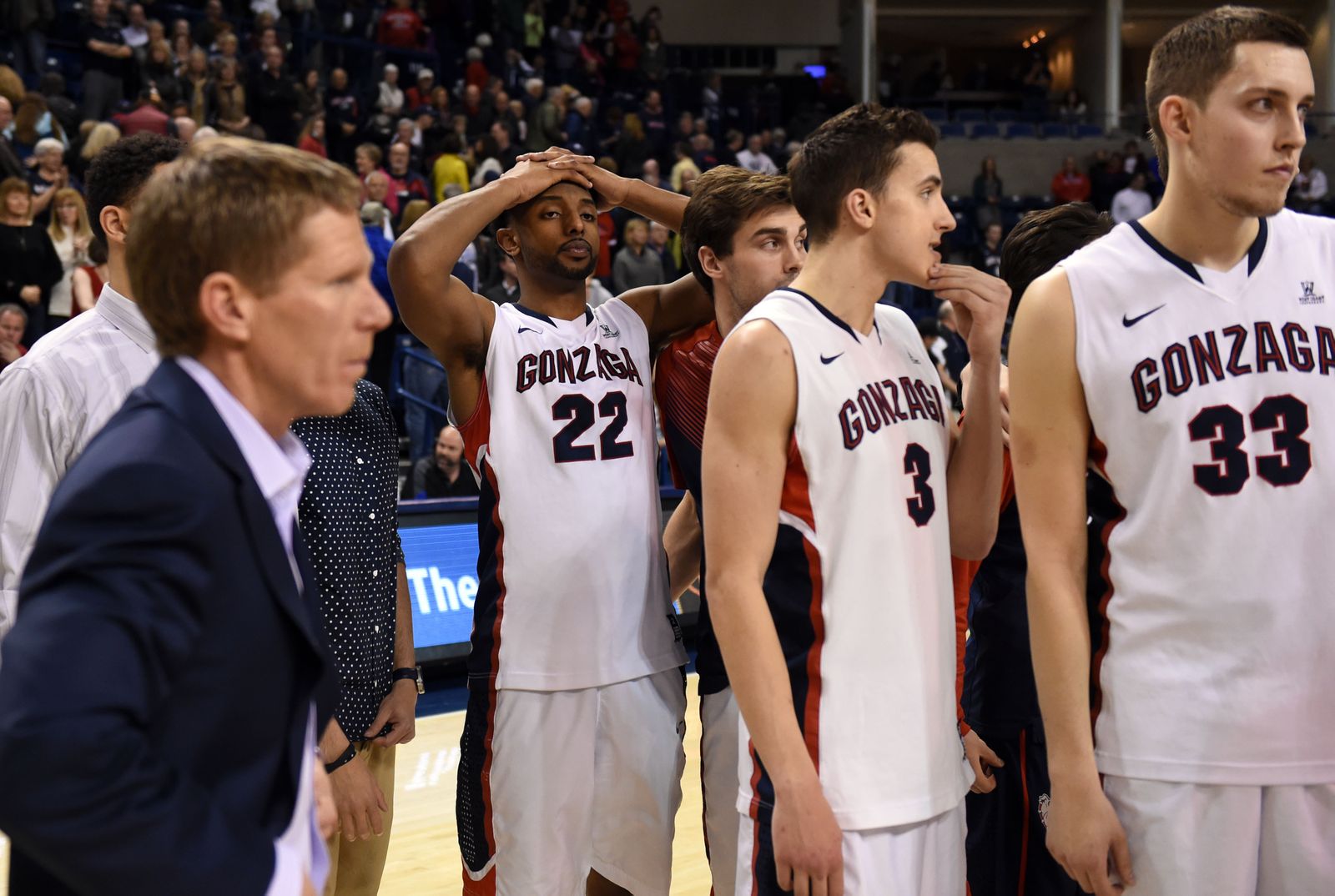 Few smiles were seen on players faces after the Bulldogs lost to BYU 73-70, Sat., Feb. 28, 2015, in the McCarthey Athletic Center.