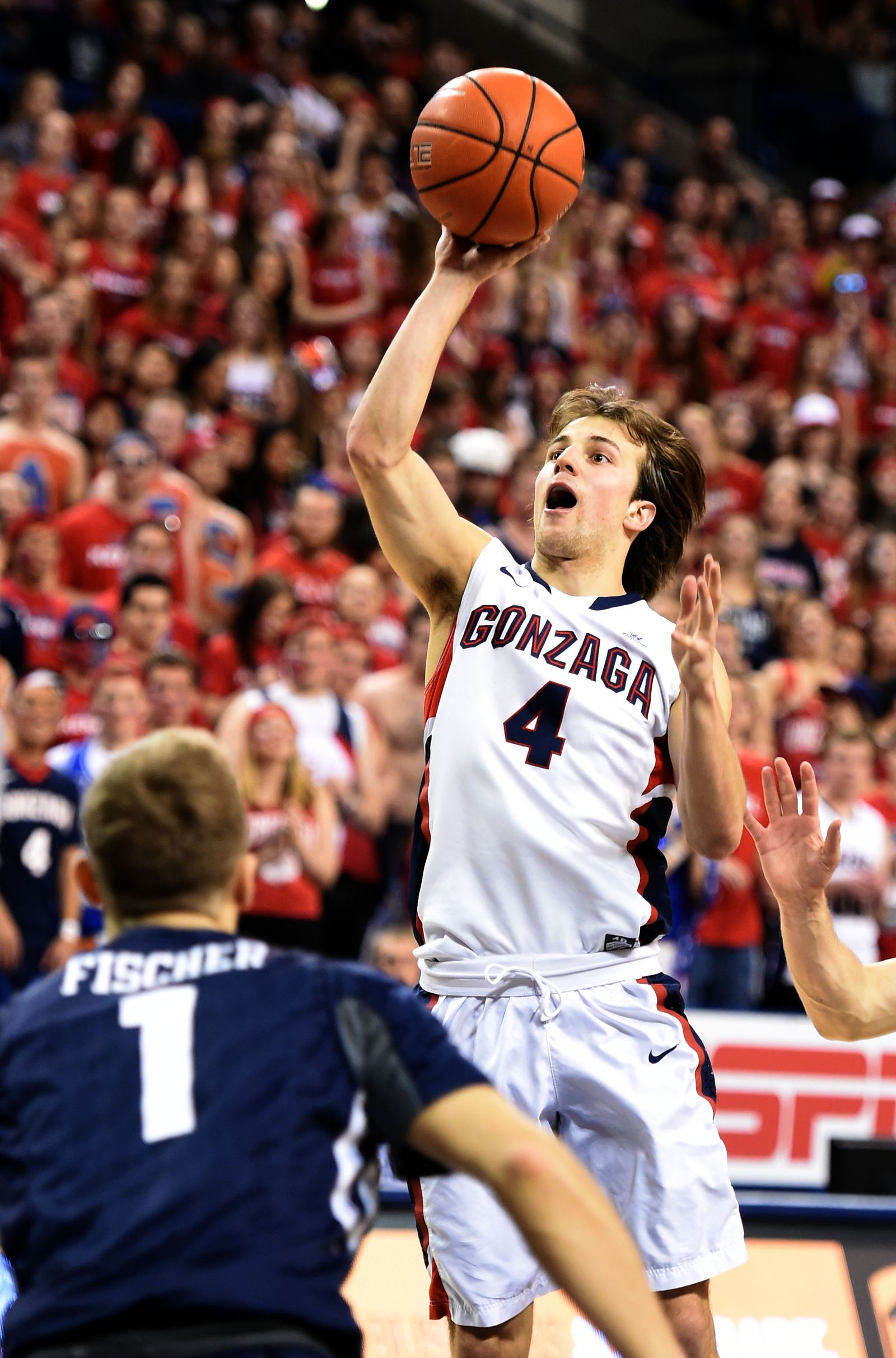 Senior, Gonzaga guard Kevin Pangos (4) makes his way through the Kennel Club student section after being introduced during Senior Night before the game with BYU, Sat., Feb. 28, 2015, in the McCarthey Athletic Center.