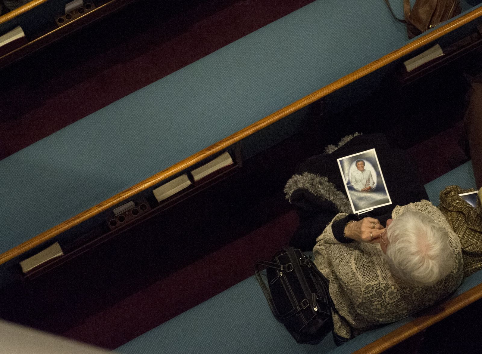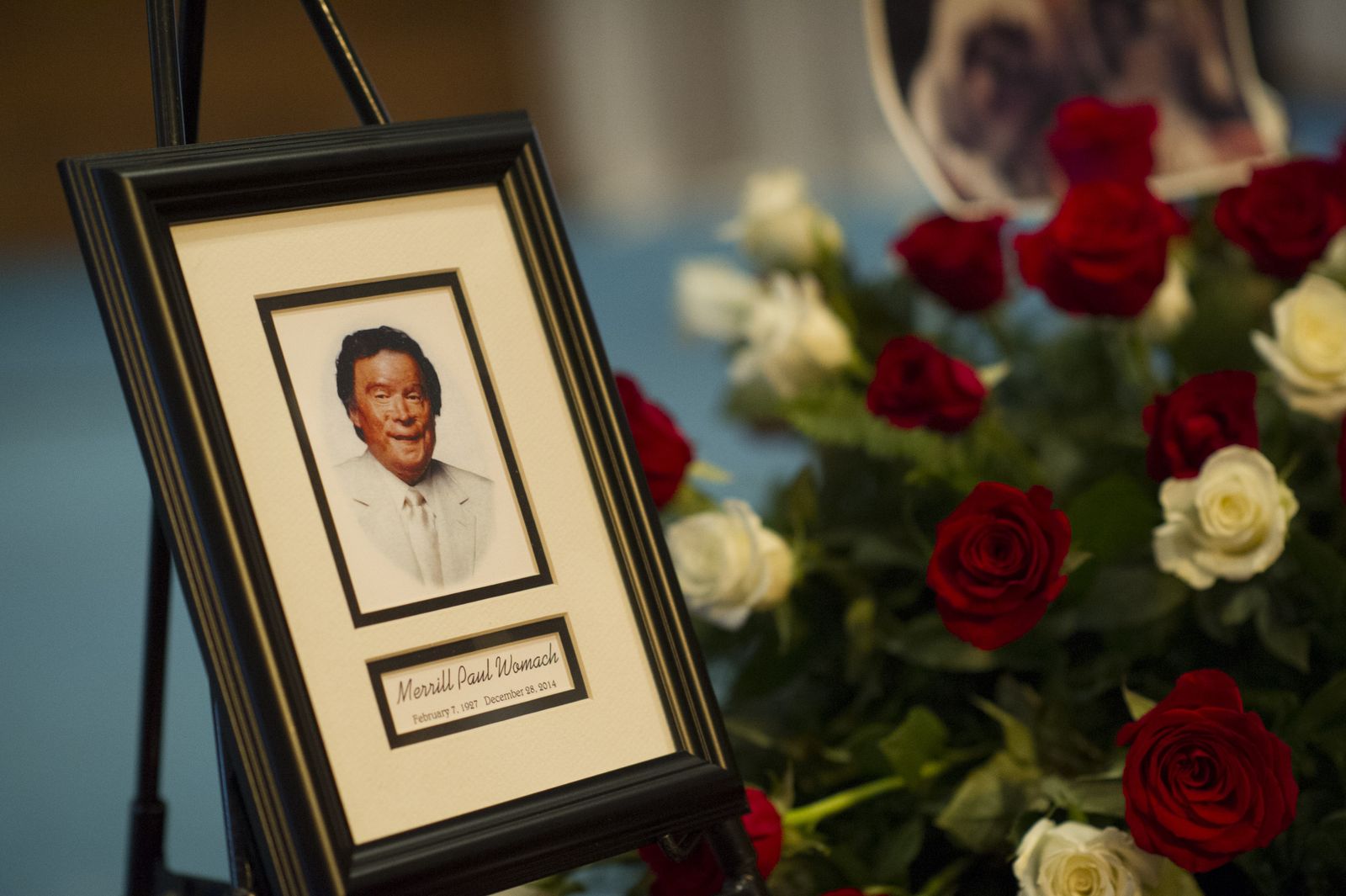A photo of famed gospel singer Merrill Womach is seen on his casket during his memorial service on Saturday, Jan 10, 2015, at Fourth Memorial Church in Spokane, Wash.