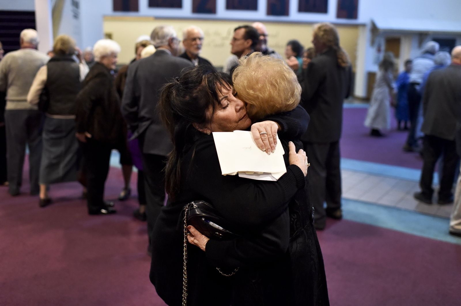 Merrill Womach’s daughter, Judy Sowards, embraces family friend Kathy Town, who said her husband Wayne was best friends with the famed gospel singer, after Womach’s memorial service on Saturday, Jan 10, 2015, at Fourth Memorial Church in Spokane, Wash.