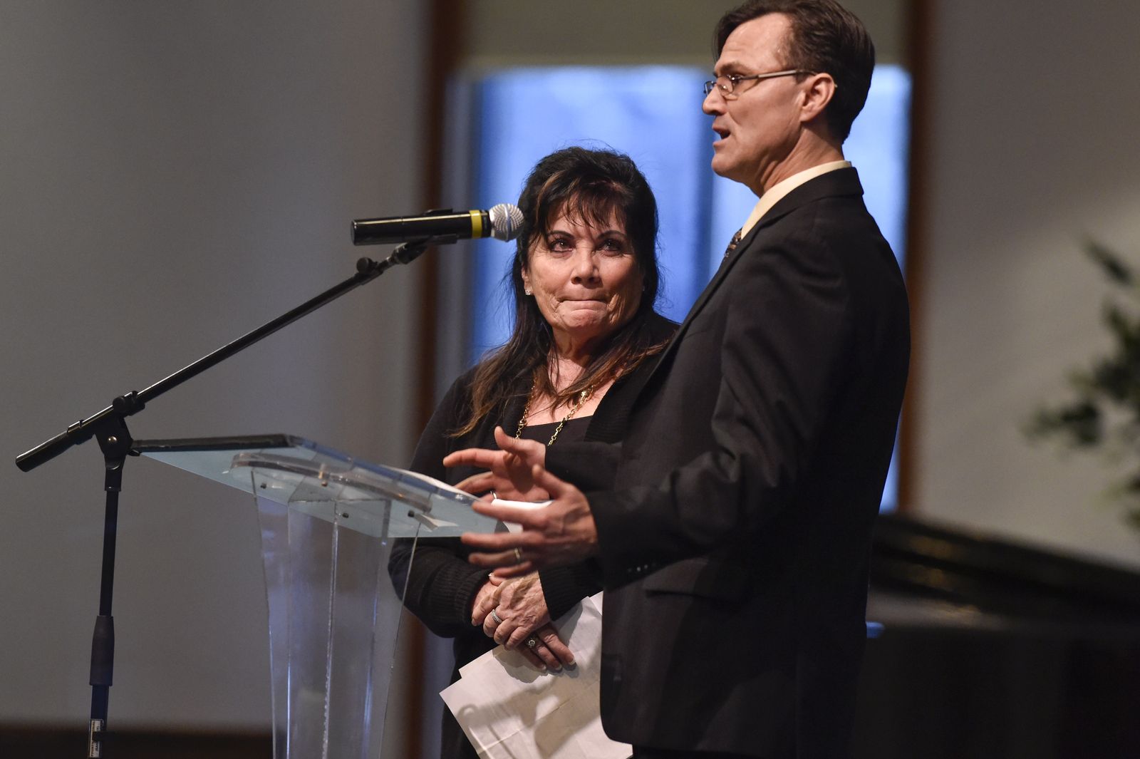 Merrill Womach’s daughter, Judy Sowards reacts as Kevin Wakefield a former employee and close friend of her father speaks during his memorial service on Saturday, Jan 10, 2015, at Fourth Memorial Church in Spokane, Wash.