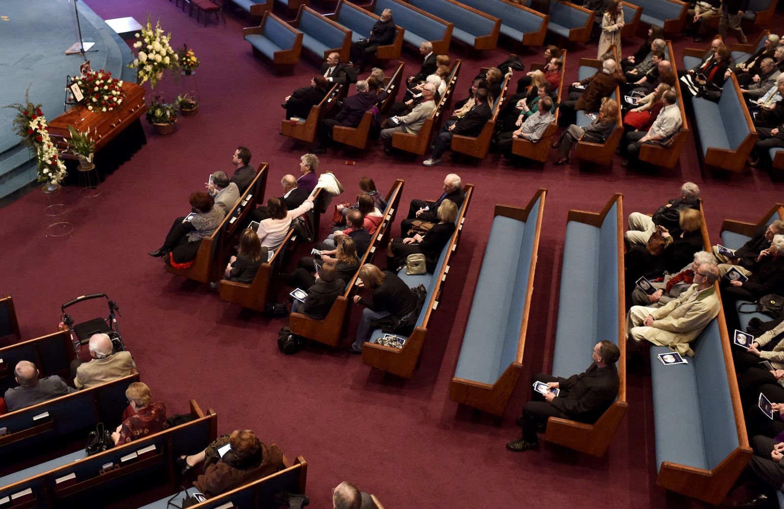 Friends and family members gather for a memorial service honoring famed gospel singer Merrill Womach on Saturday, Jan 10, 2015, at Fourth Memorial Church in Spokane, Wash. Womack was burned severely in a plane crash in 1961. He spent 50 weeks in a hospital and made a comeback after numerous reconstructive surgeries.