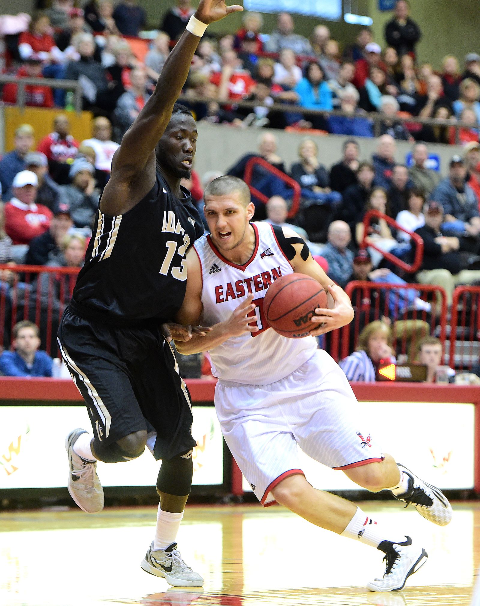 Eastern Washington’s Ognjen Miljkovic (0) drives against Idaho’s Bira Seck (13) during a college basketball game on Saturday, Jan 31, 2015, in Cheney, Wash.