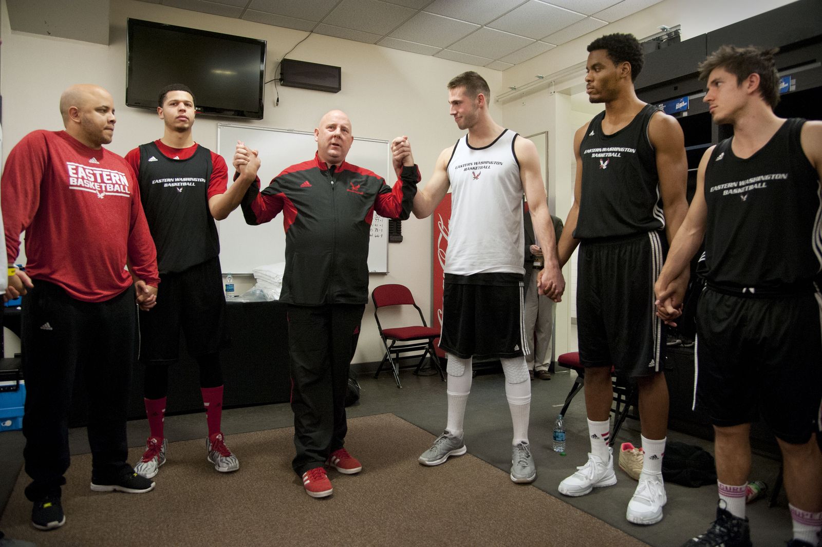 EWU’s head coach Jim Hayford gathers players and coaches for a few words of encouragement before a practice session, March 18, 2015, in Portland’s Moda Center. “Everything we need is in this room.” said Hayford.