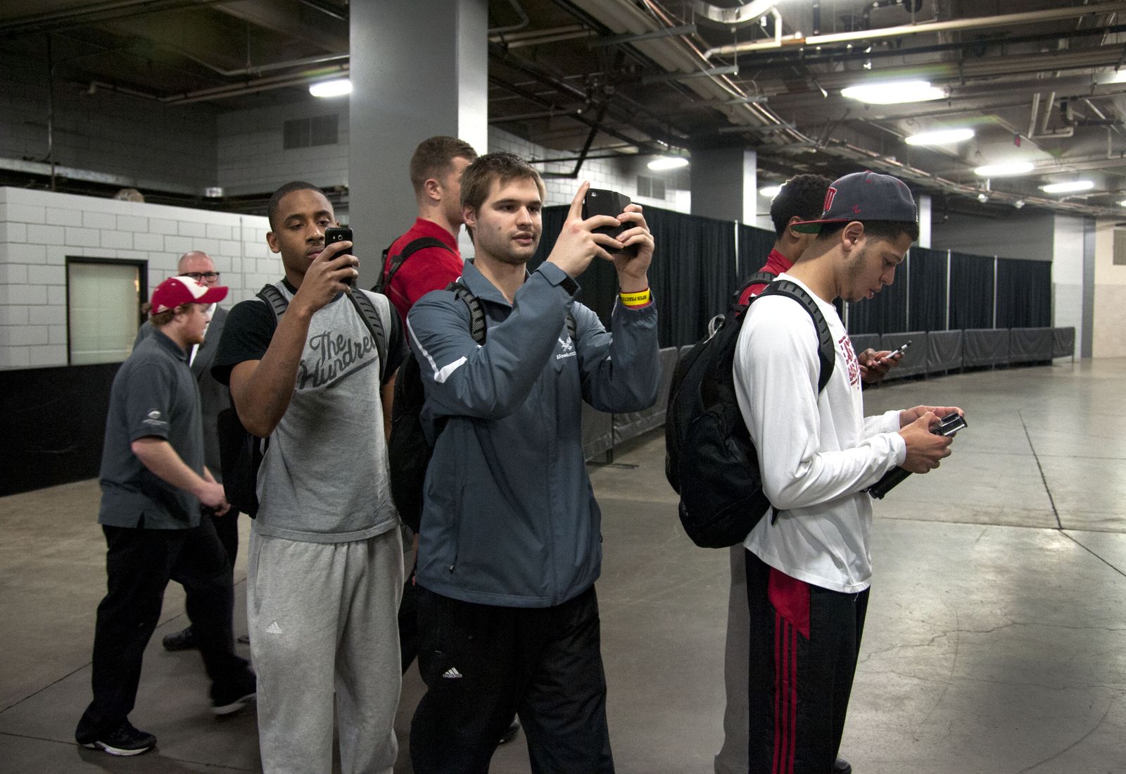 Eastern Washington University basketball players Sir Washington, left, and Tyler Harvey, right, along with assistant coach David Riley, center, pause in the Moda Center to take cell phone photos of a Portland Trail Blazers “Rip City” wall mural as the Eagles arrive for a practice session for the 2015 NCAA Men’s Basketball championship second round game