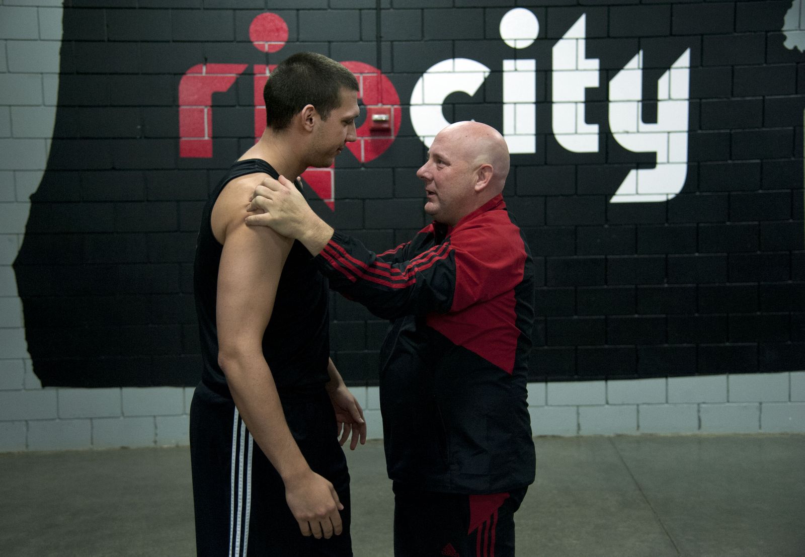 EWU’s head coach Jim Hayford has words of encouragement for his player Ognjen Miljkovic before a practice session, March 18, 2015, in Portland’s Moda Center.