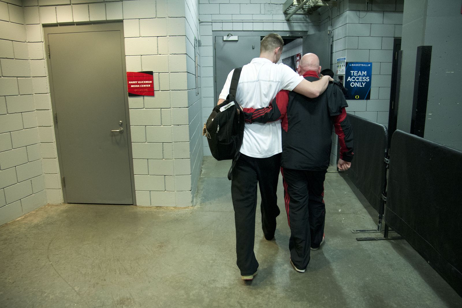 Eastern Washington University’s Felix Von Hofe and coach Jim Hayford walk arm and arm as they arrive in the Moda Center for a practice session for the 2015 NCAA Men’s Basketball championship second round game.