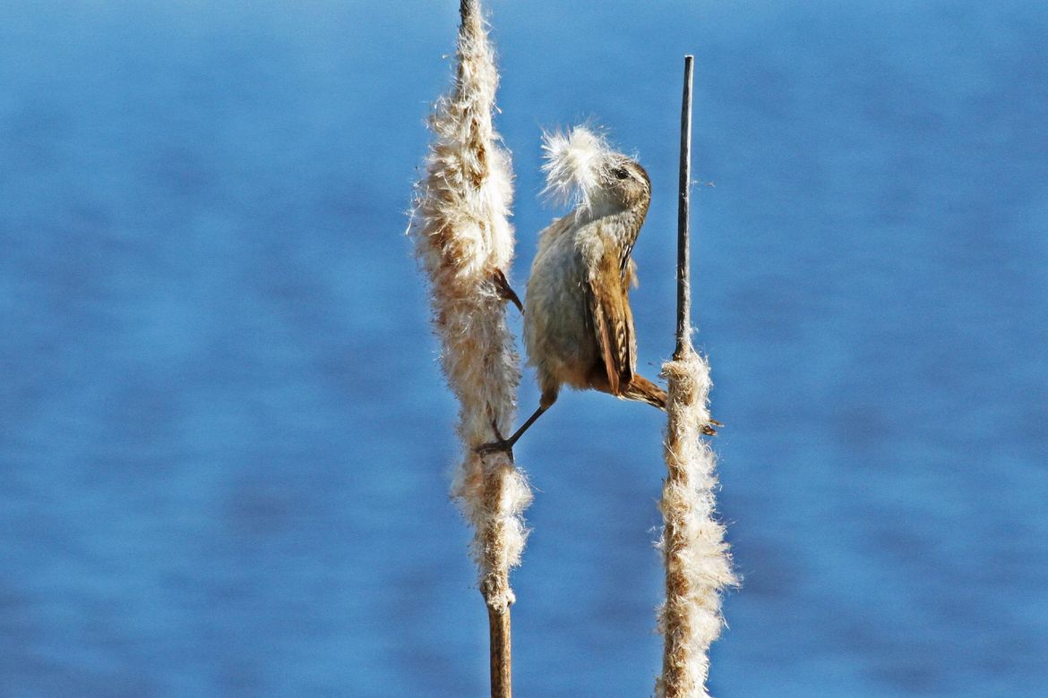 A Marsh Wren is collecting the cattail seed fluff to line the inside of its nest at Turnbull NWR.