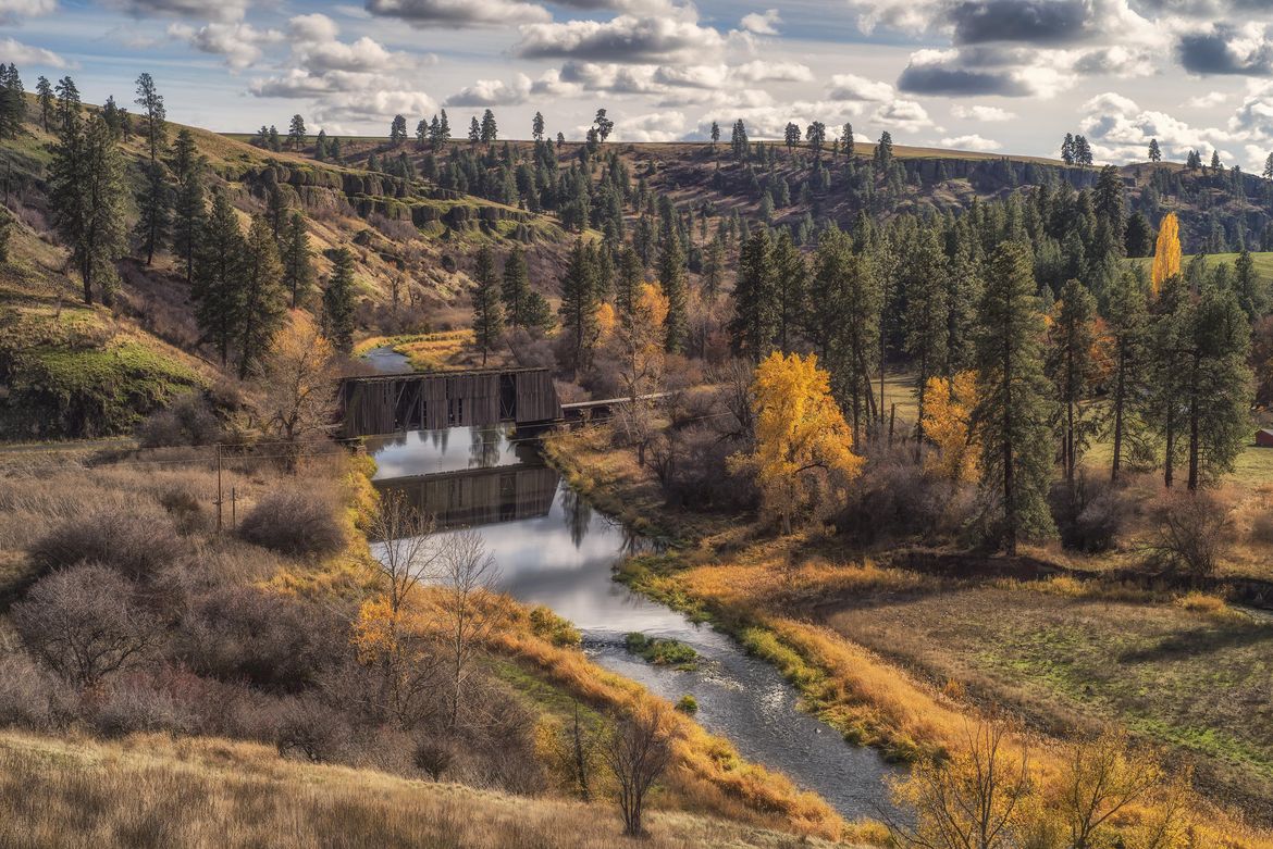 Manning Rye covered bridge near Colfax, Washington on a beautiful autumn day.