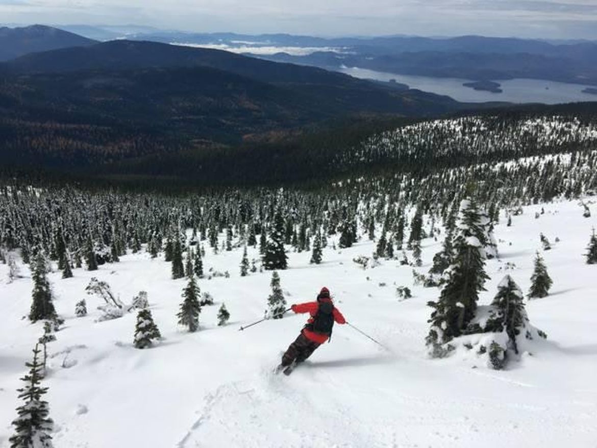 Skiing off Horton Ridge in the Idaho Selkirk Mountains toward Priest Lake in the distance.