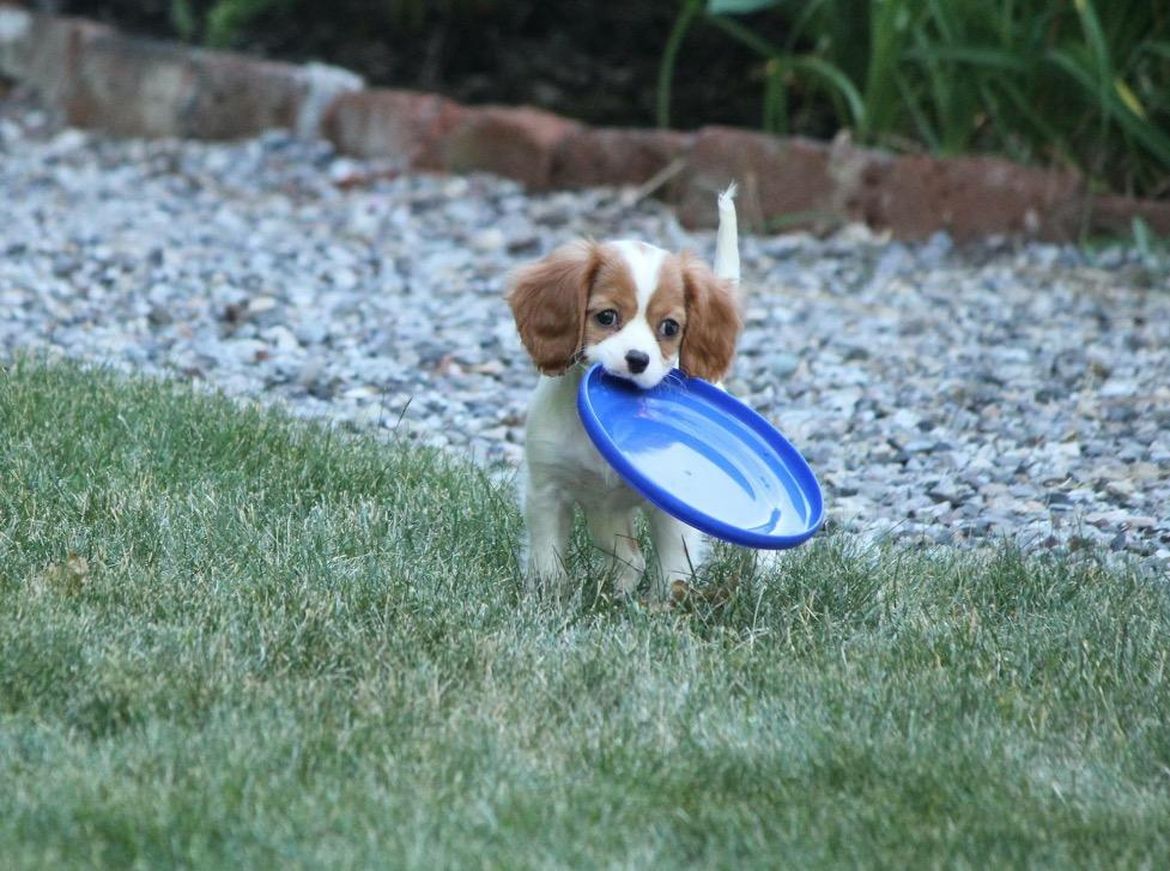 Phoebe the Cavalier King Charles Spaniel is playing with her A&W flying disc in our backyard in Spokane when we first got her in early July.
