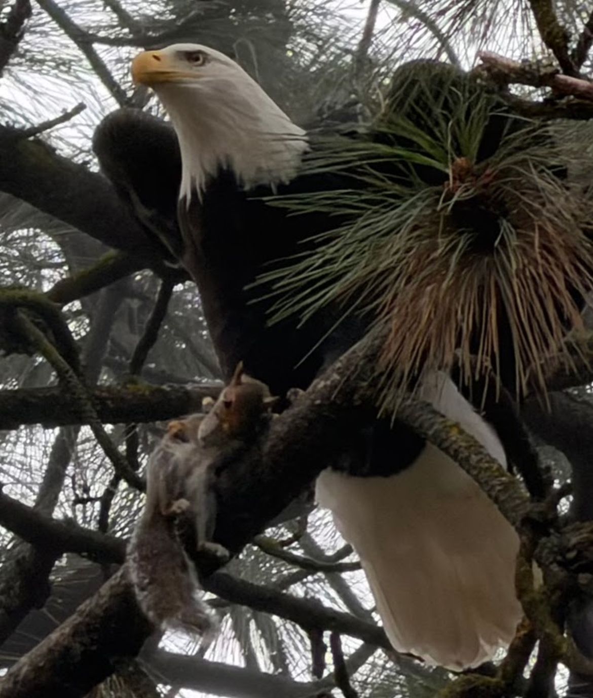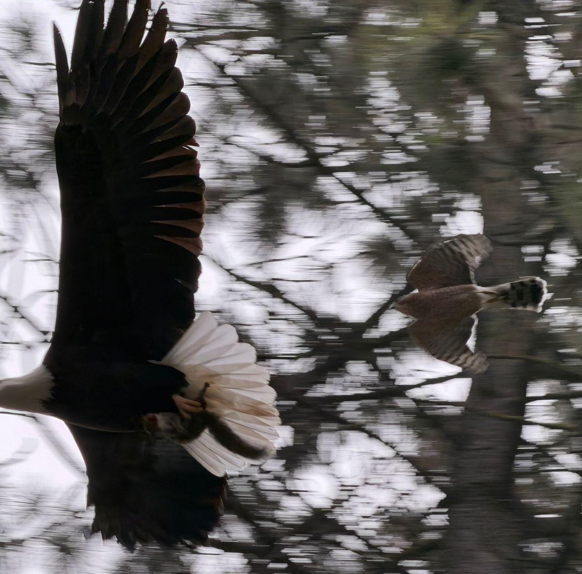 Bald Eagle, prey in talons, pursued by Sharp-shin hawk. Sherwood forest, Spokane Valley. Photo by Cody Coleman