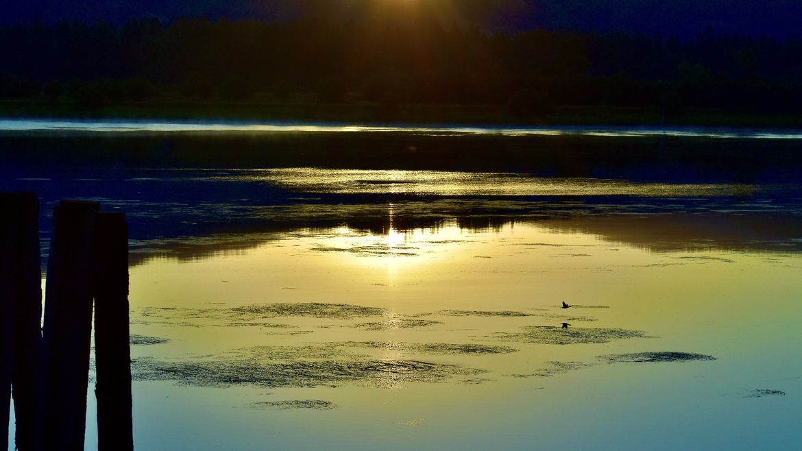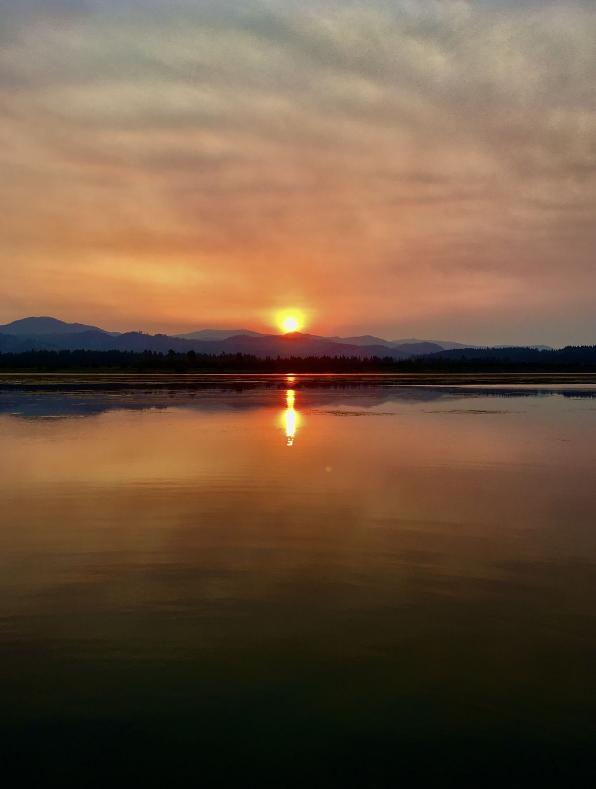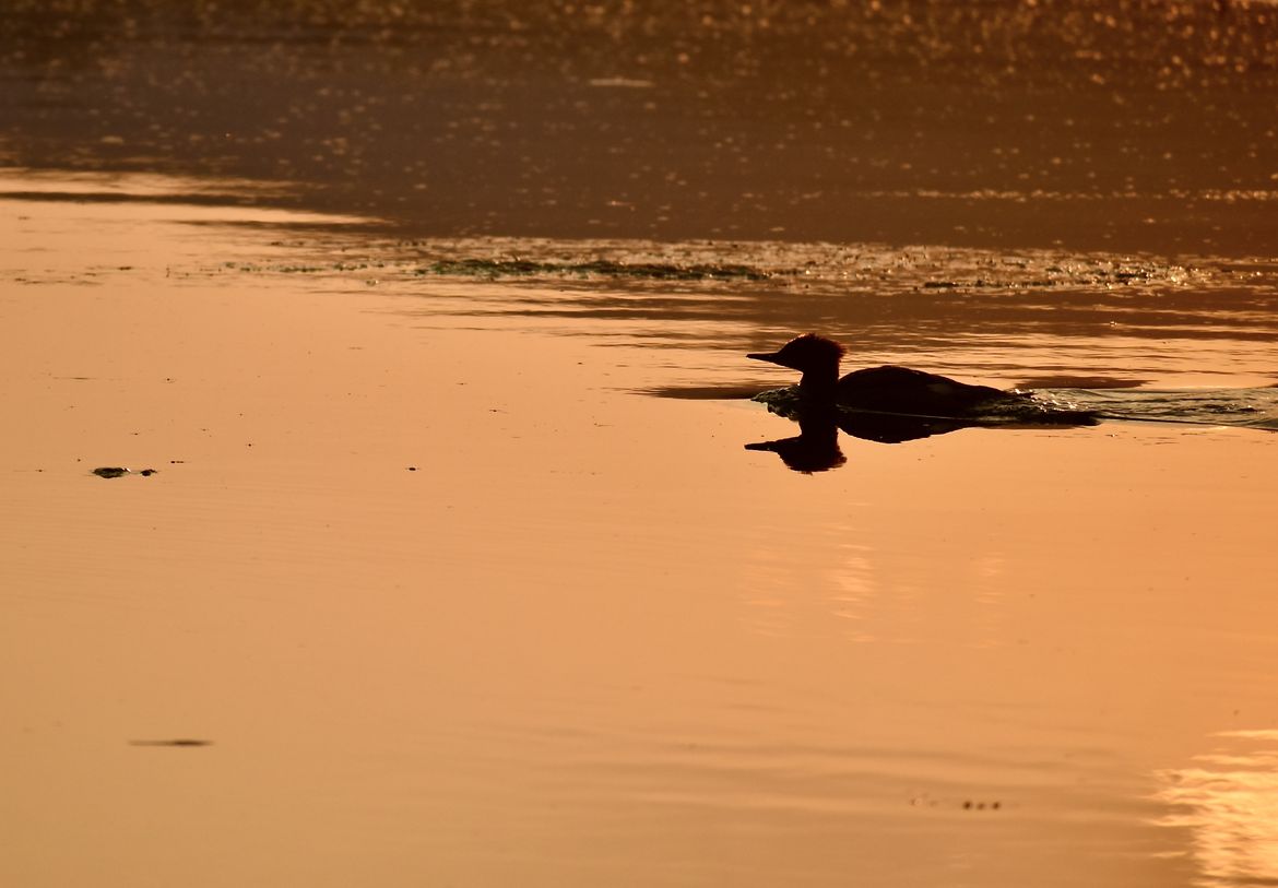 Merganser Duck swimming in the morning's smoke hazed sunrise, Pend Oreille River, August 26th