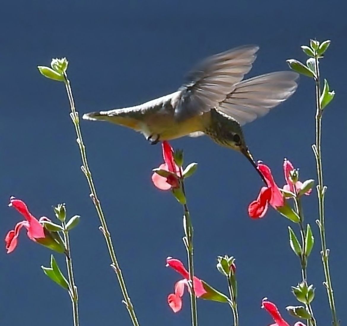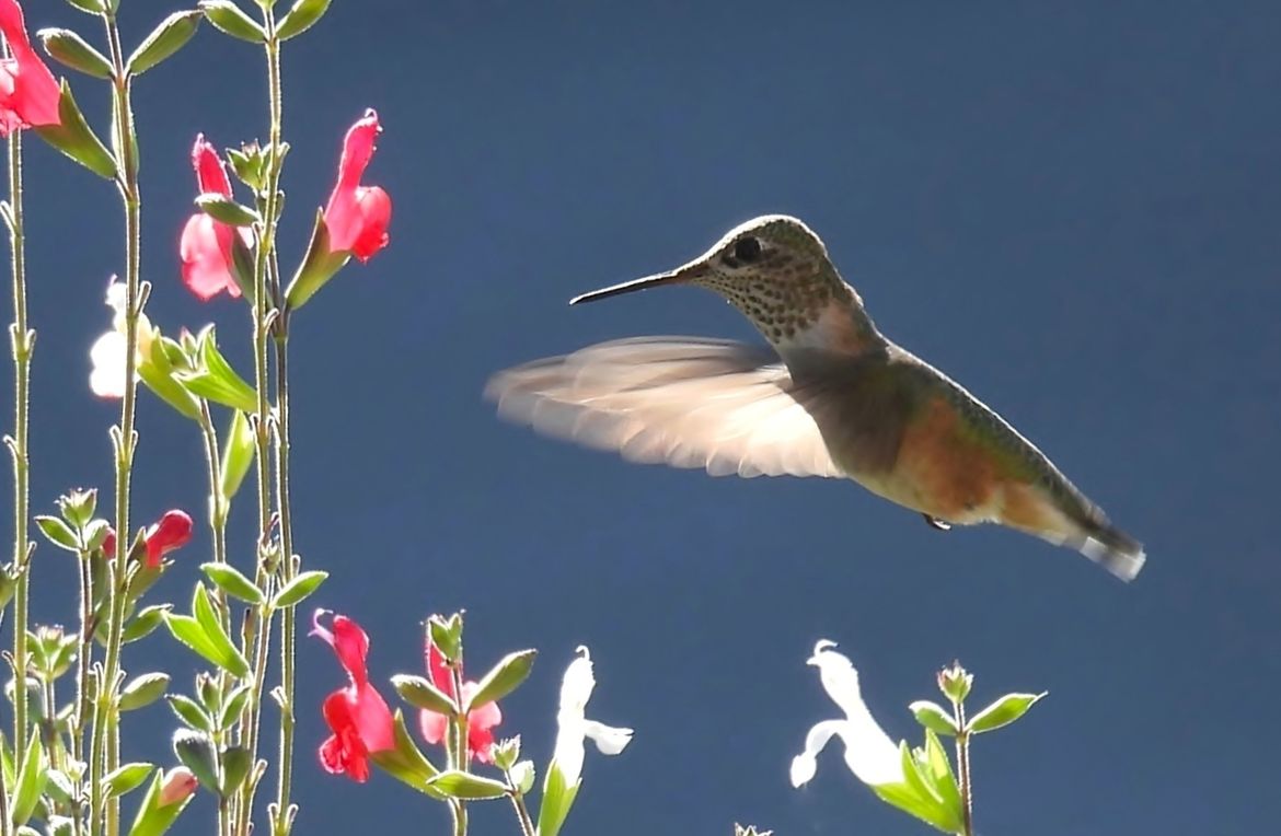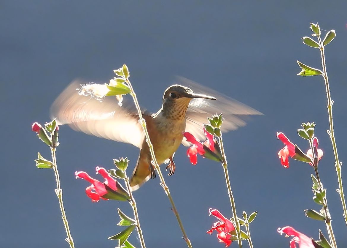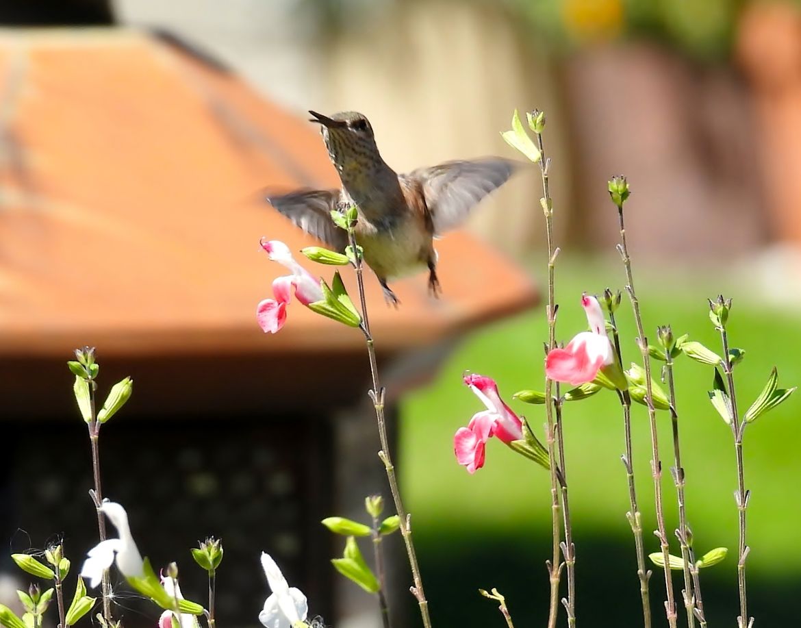 Hummingbird amongst the lipstick flowers on the last day of August 2025.