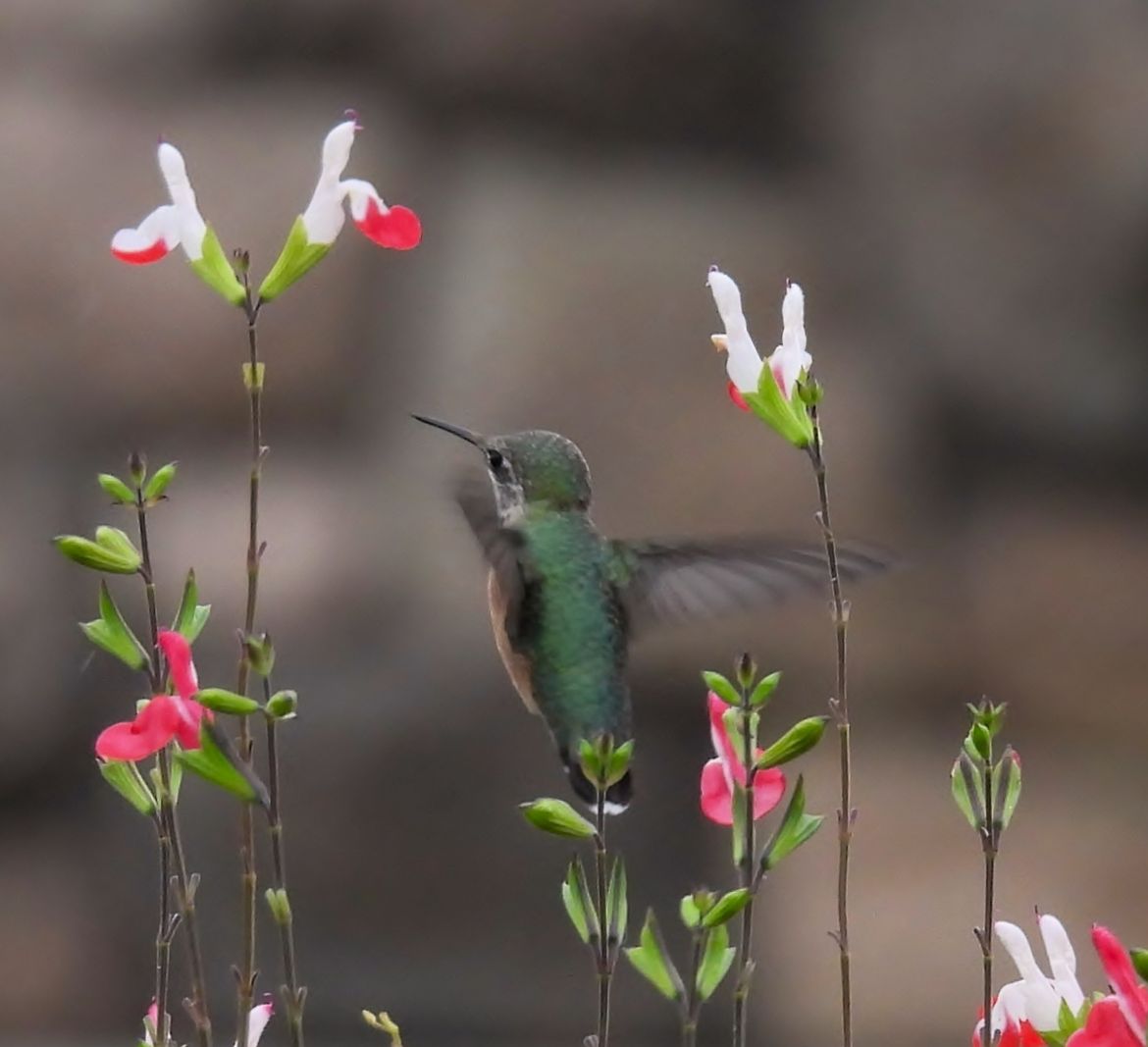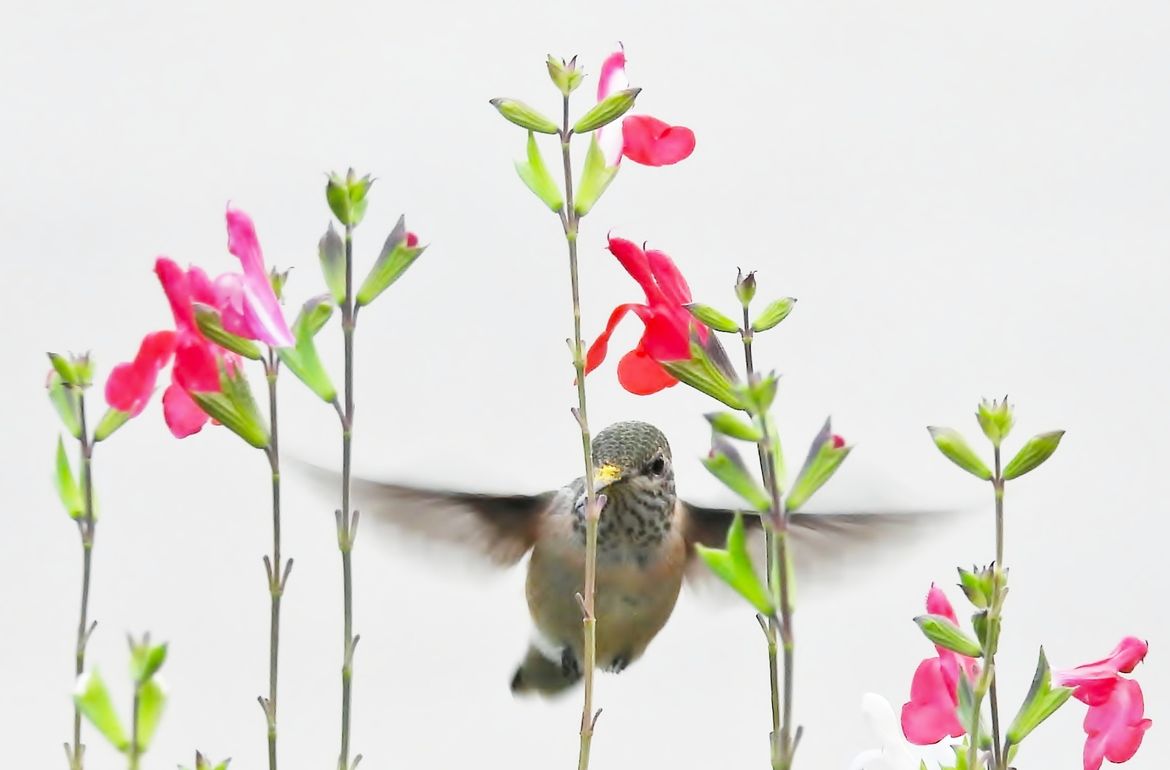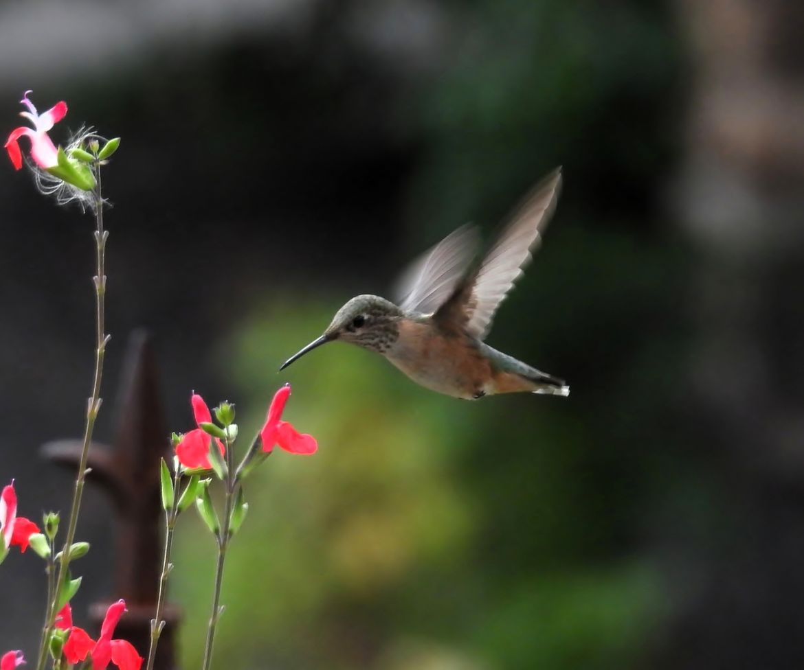 Hummingbird amongst the lipstick flowers on the last day of August 2025.