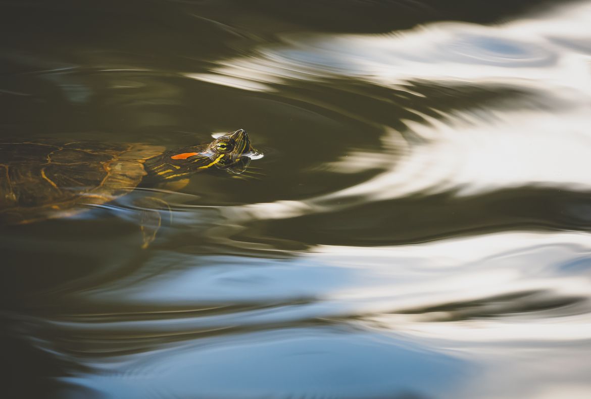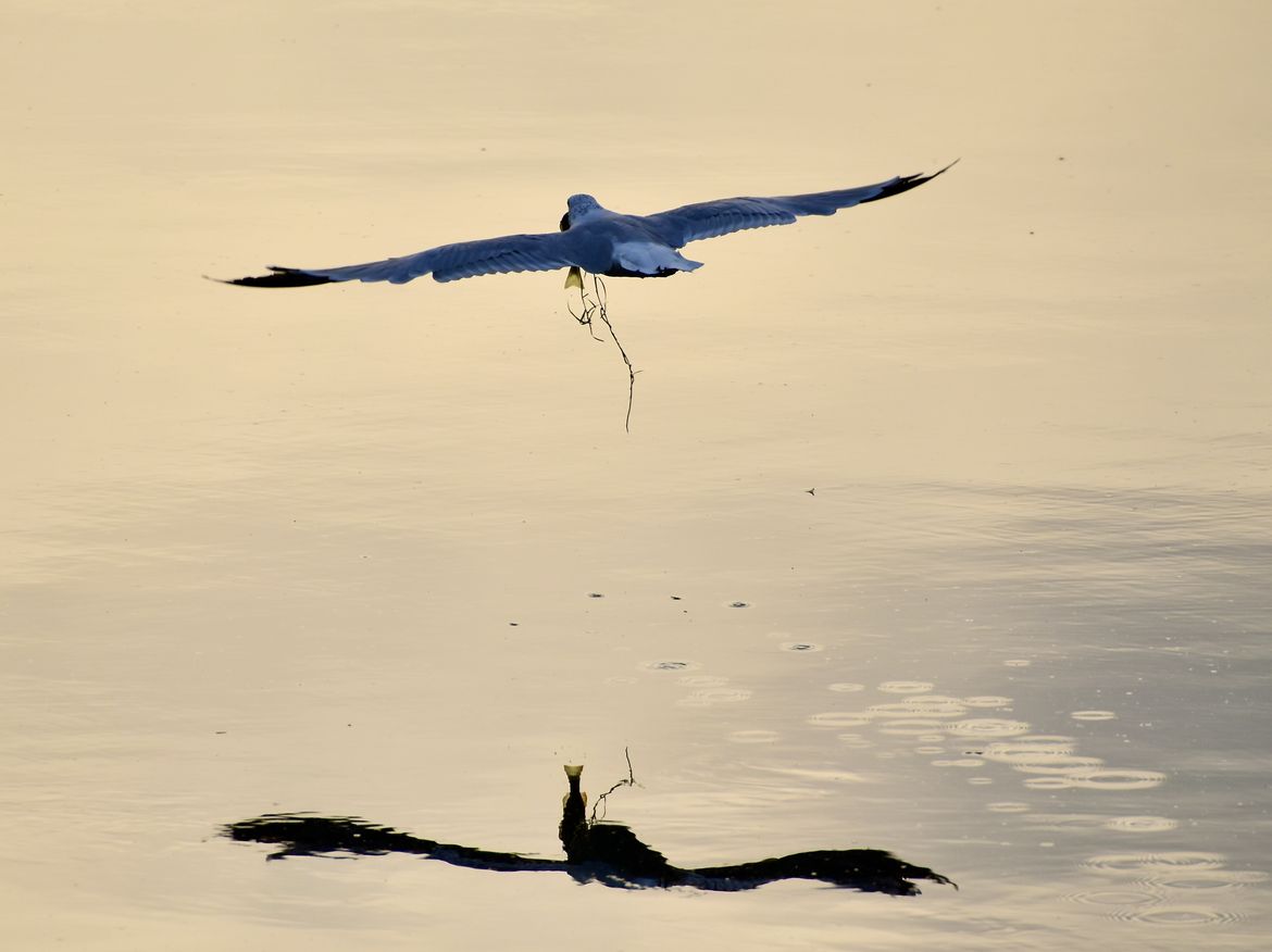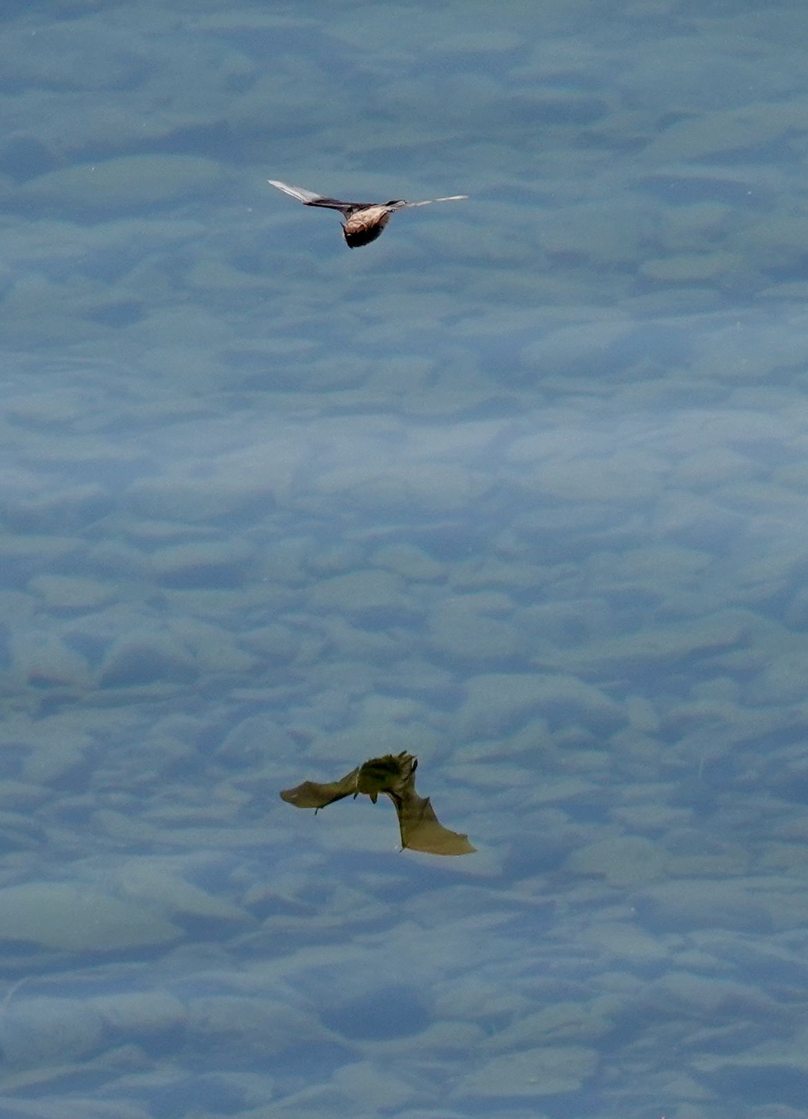 A bat hunting in broad daylight, reflected on the mirror-like surface of Lake Coeur d'Alene.