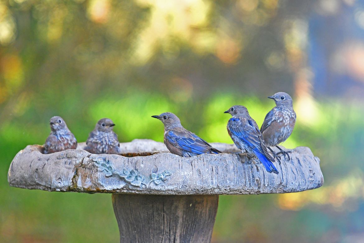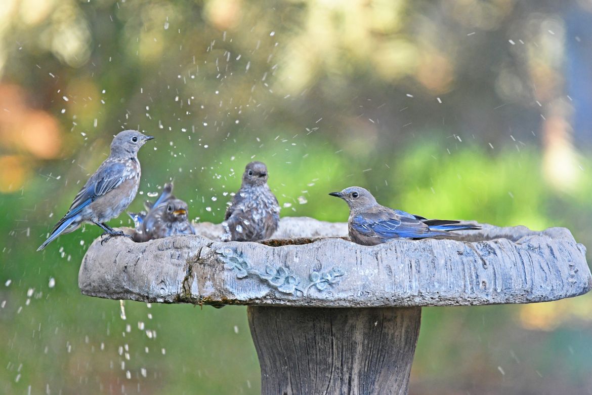 The bluebird family visits for their daily bath and cooling off time. Four Lakes, WA, August 20 2025