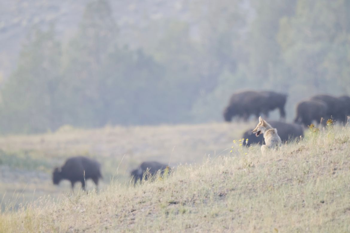 Wishful thinking. Coyote following a herd of bison at the bison range in Montana. 8/13/25