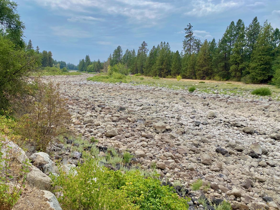 The bone dry bed of our beloved Spokane River halfway between Barker and Flora Road on August 28, 2025. Consequently, the entirety of river flow through downtown at this time is contributed by the Spokane Valley - Rathdrum Prairie aquifer.