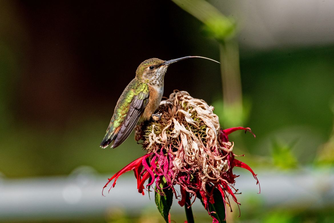 The "Bee Balm" is at the end of it's flowering life, but this little hummingbird is sticking out his tongue to guard the last of his prize. Four Lakes, WA August 4, 2025