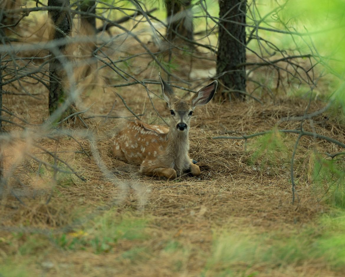 Photo was taken on 08-05-2025 In Cheney, WA from my deck. Photo is one of two mule deer twin fawns. My granddaughter named her Dotty.