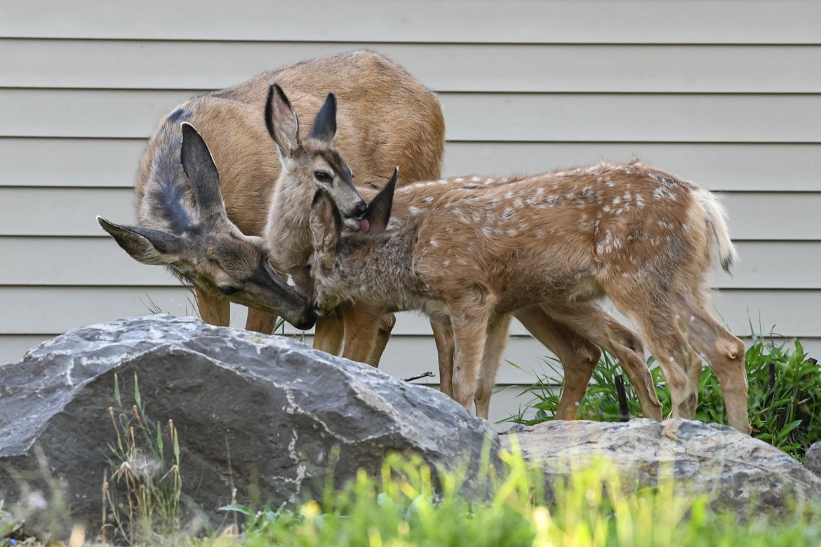 A mother deer with twin fawns share a quiet moment in Cheney in the 2nd week of August. It seems really late in the season to have babies that still have their spots