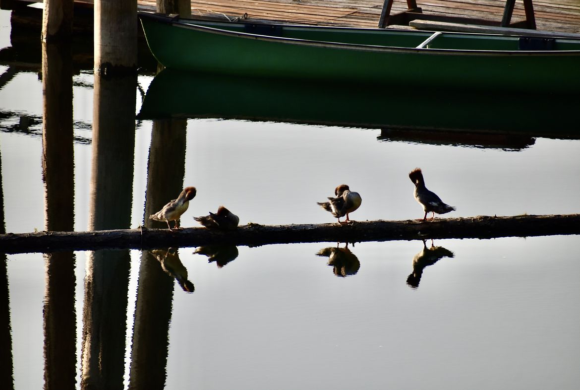 Merganser pairs preparing the day in the calm early morning, August 3rd, Pend Oreille River