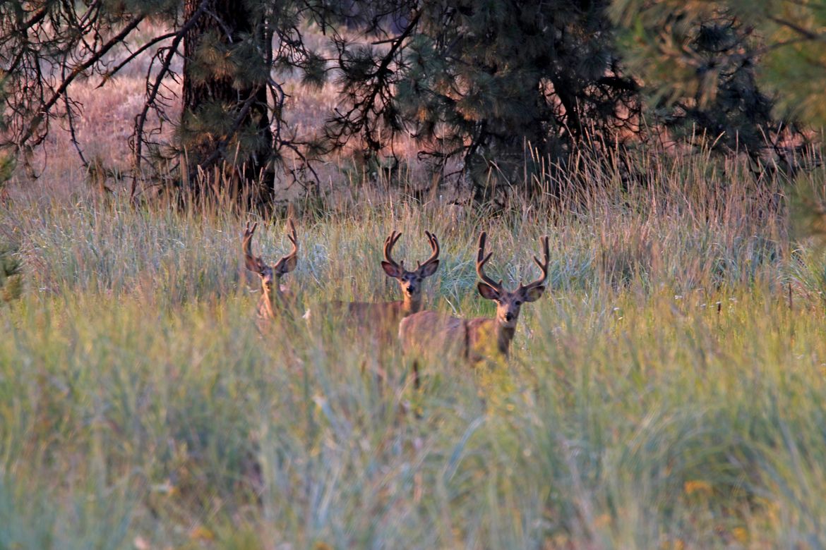 3 Mule Deer Bucks in the morning sun south of Cheney taken 7 14 2025. All three sporting some pretty good racks. .