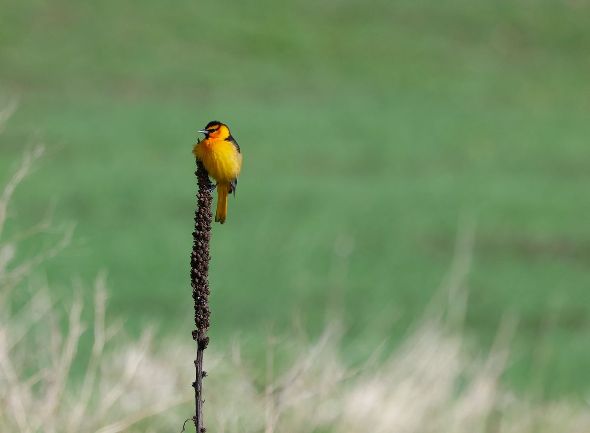 Male bullock's oriole rests on a perch. Saltese wetlands, early July.