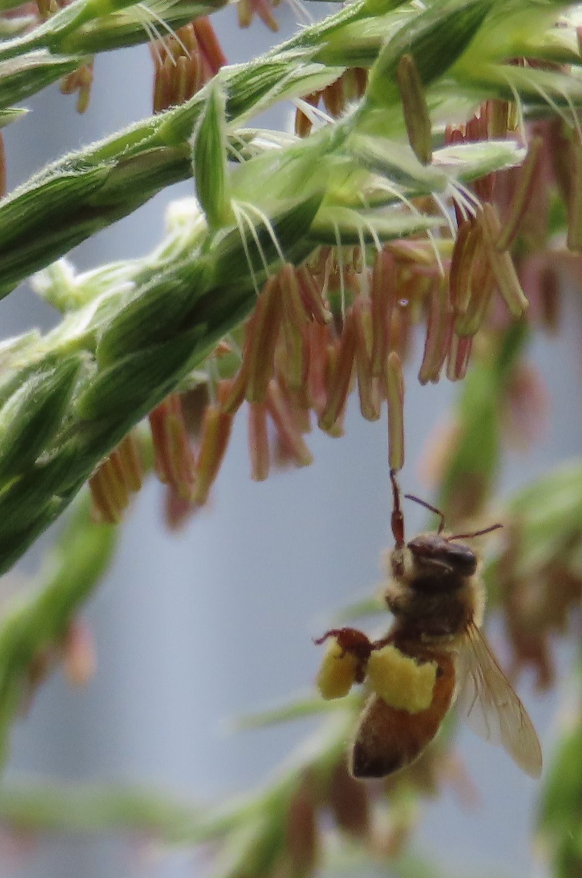 "A little help here!" A honey bee on the corn stalk may have collected a bit too much nectar.