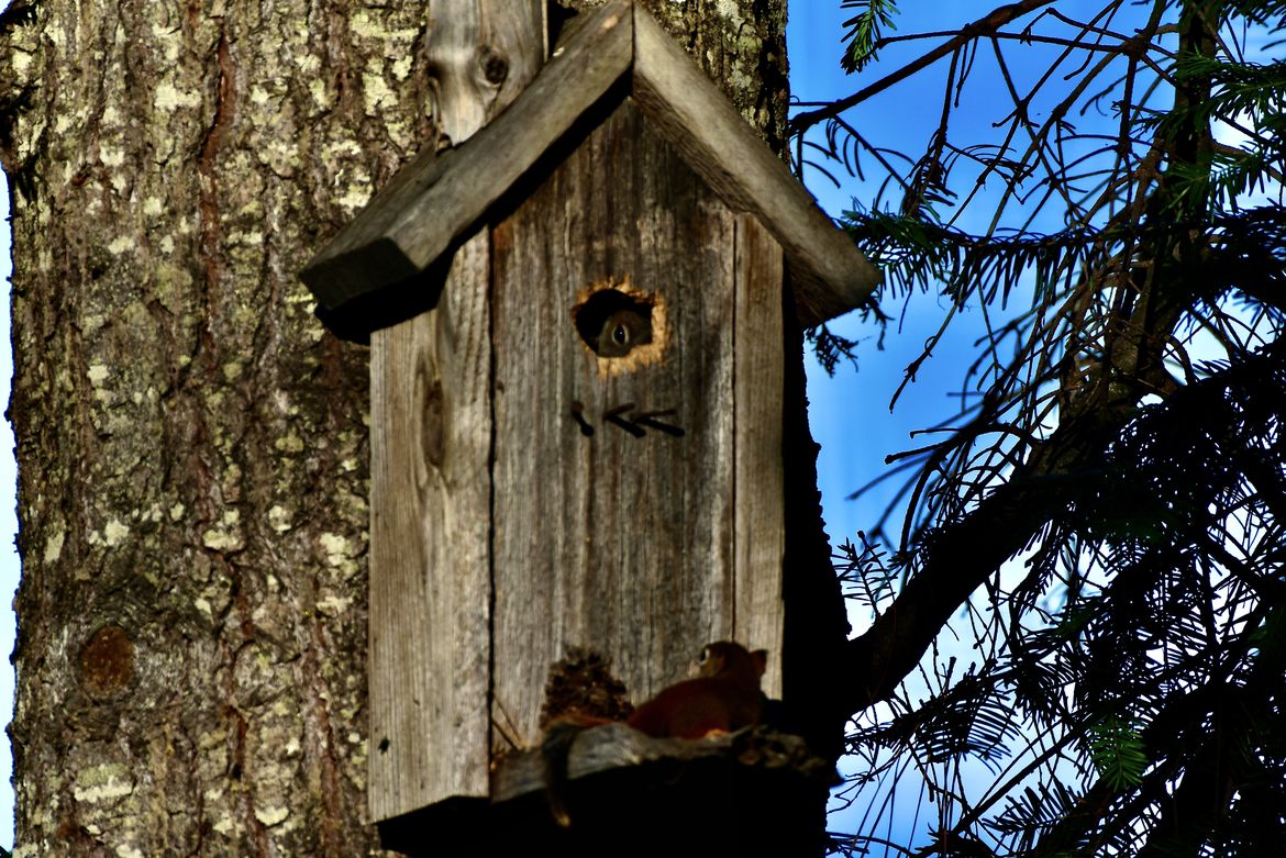 Squirrels checking out a bird house, Usk, WA, 7-8-25