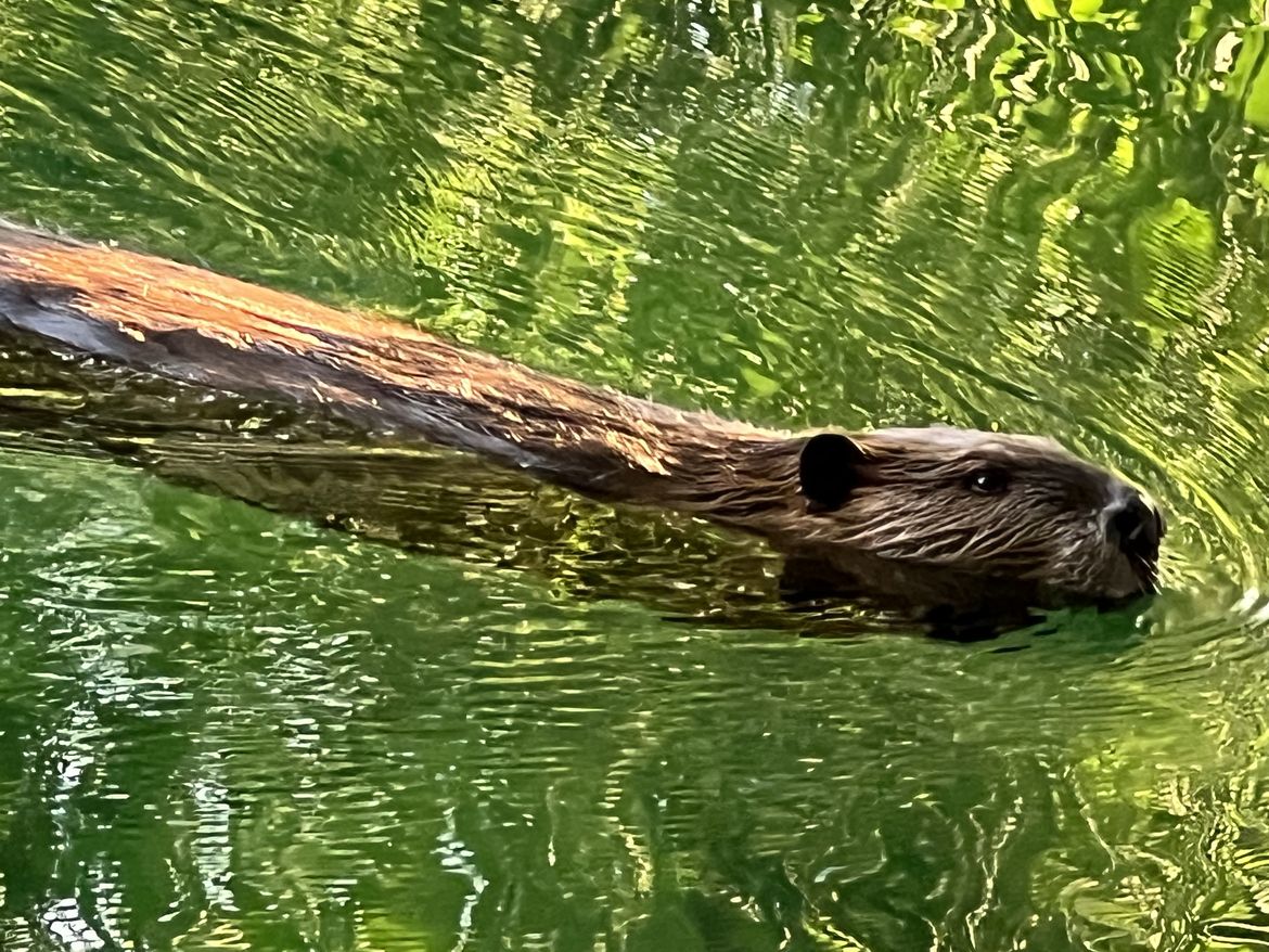 The greenery of the trees is reflected in the water where a beaver swims in the Spokane River near the campus of Gonzaga University.