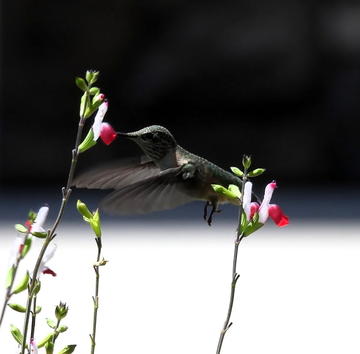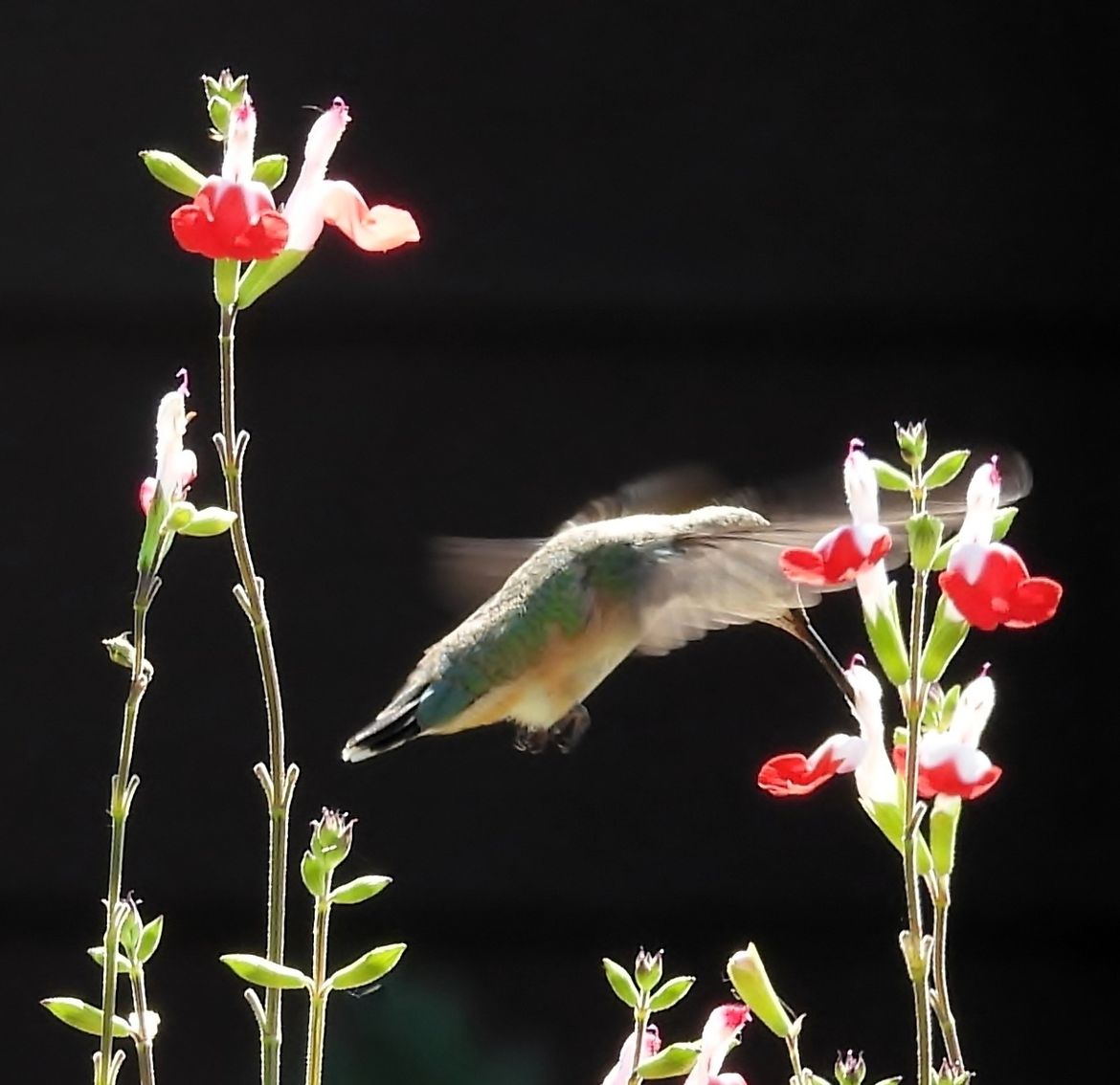 Hummingbird returns to the Lipstick flowers.